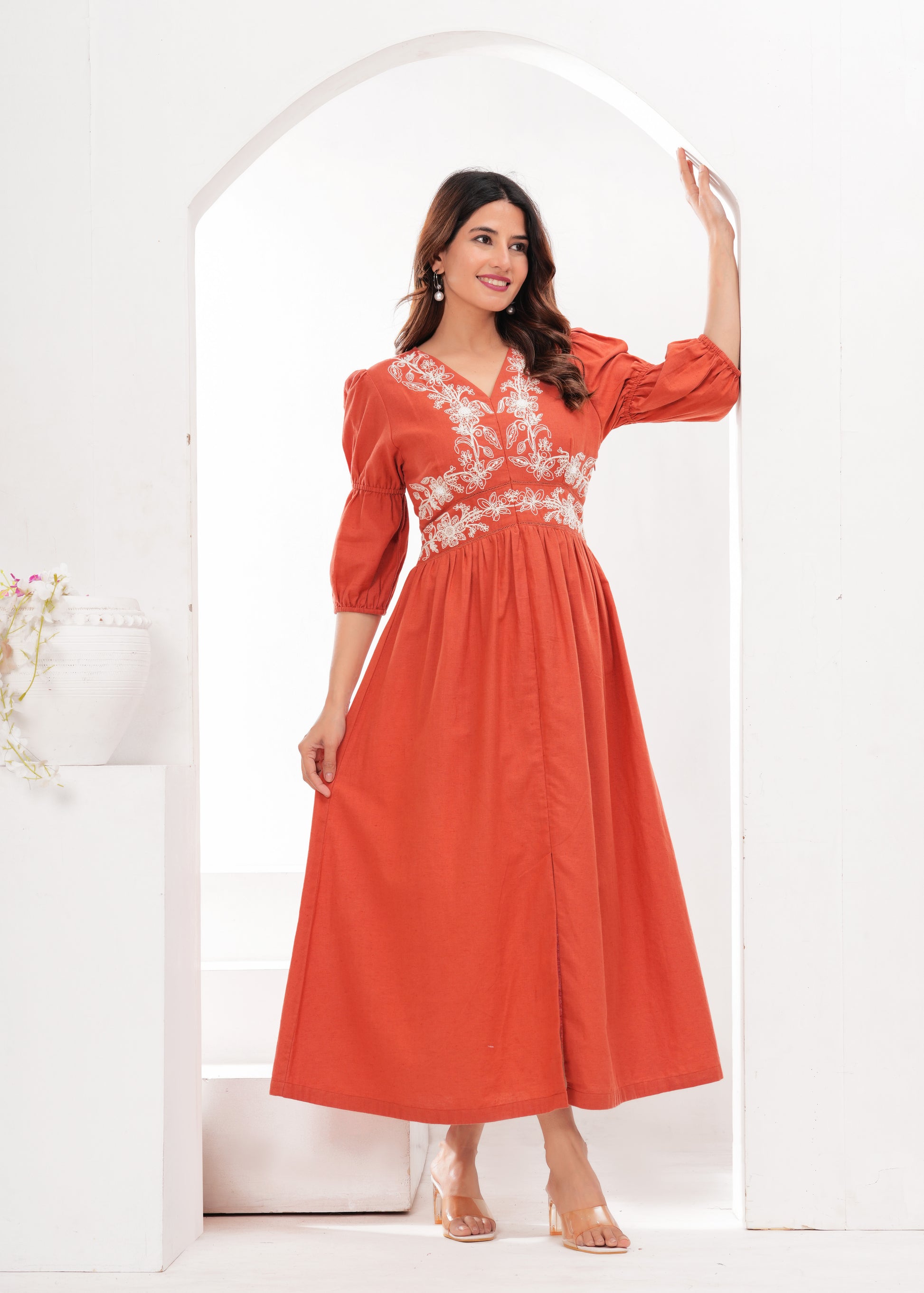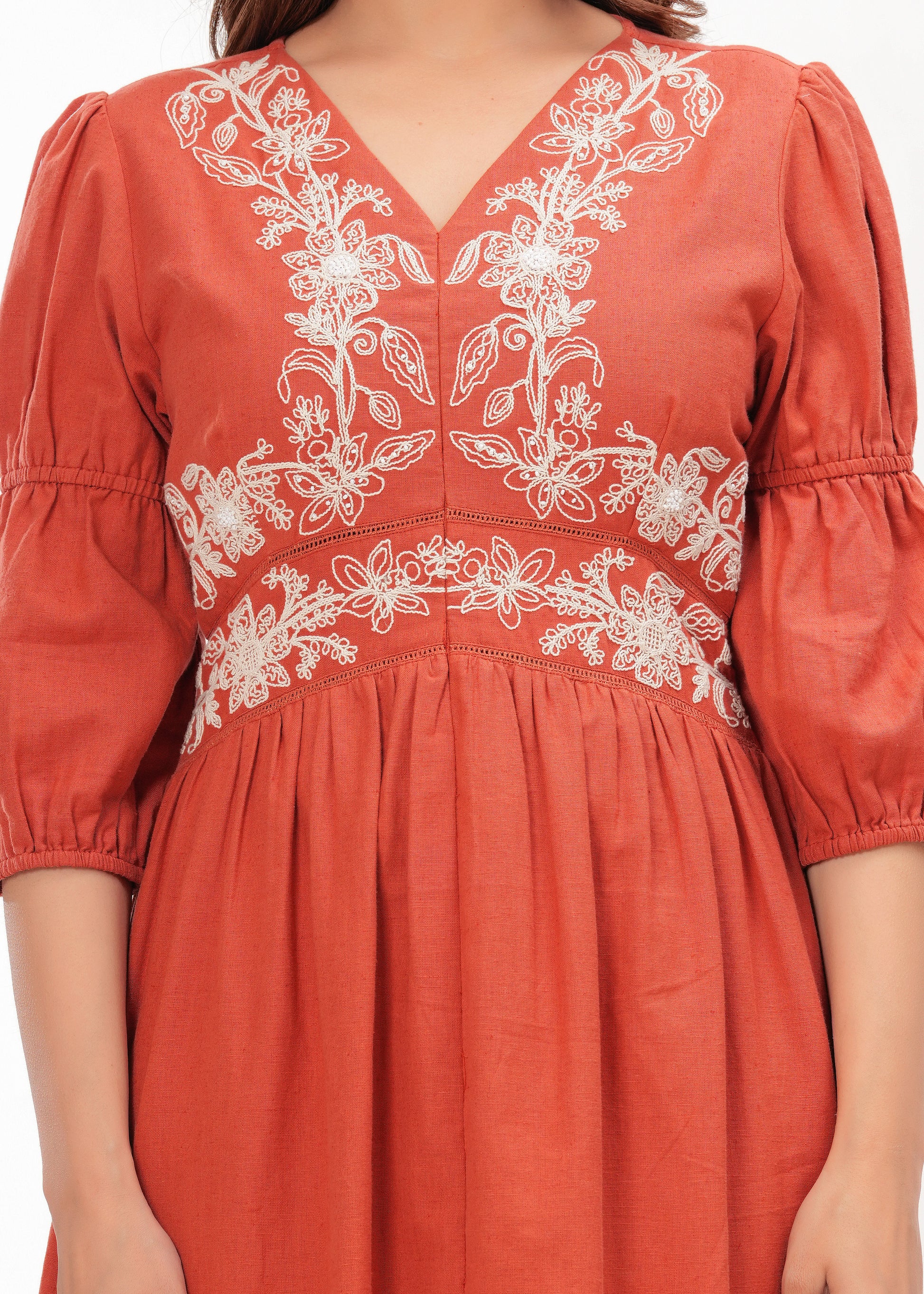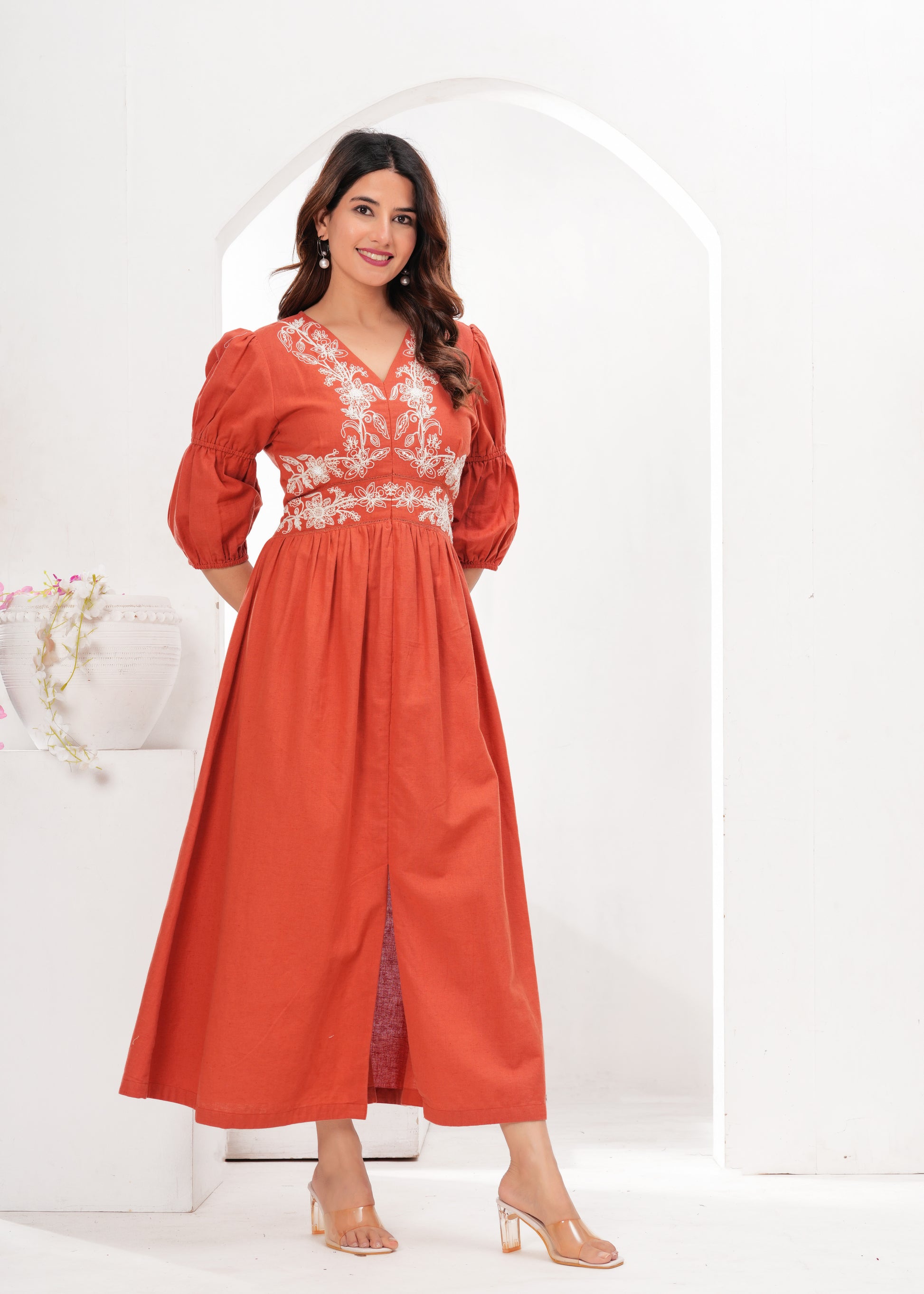 Soft cotton, subtle embroidery, and an effortless silhouette — the Apricot Bloom Dress brings warmth and ease to everyday dressing. Crafted for comfort, made to move with you.