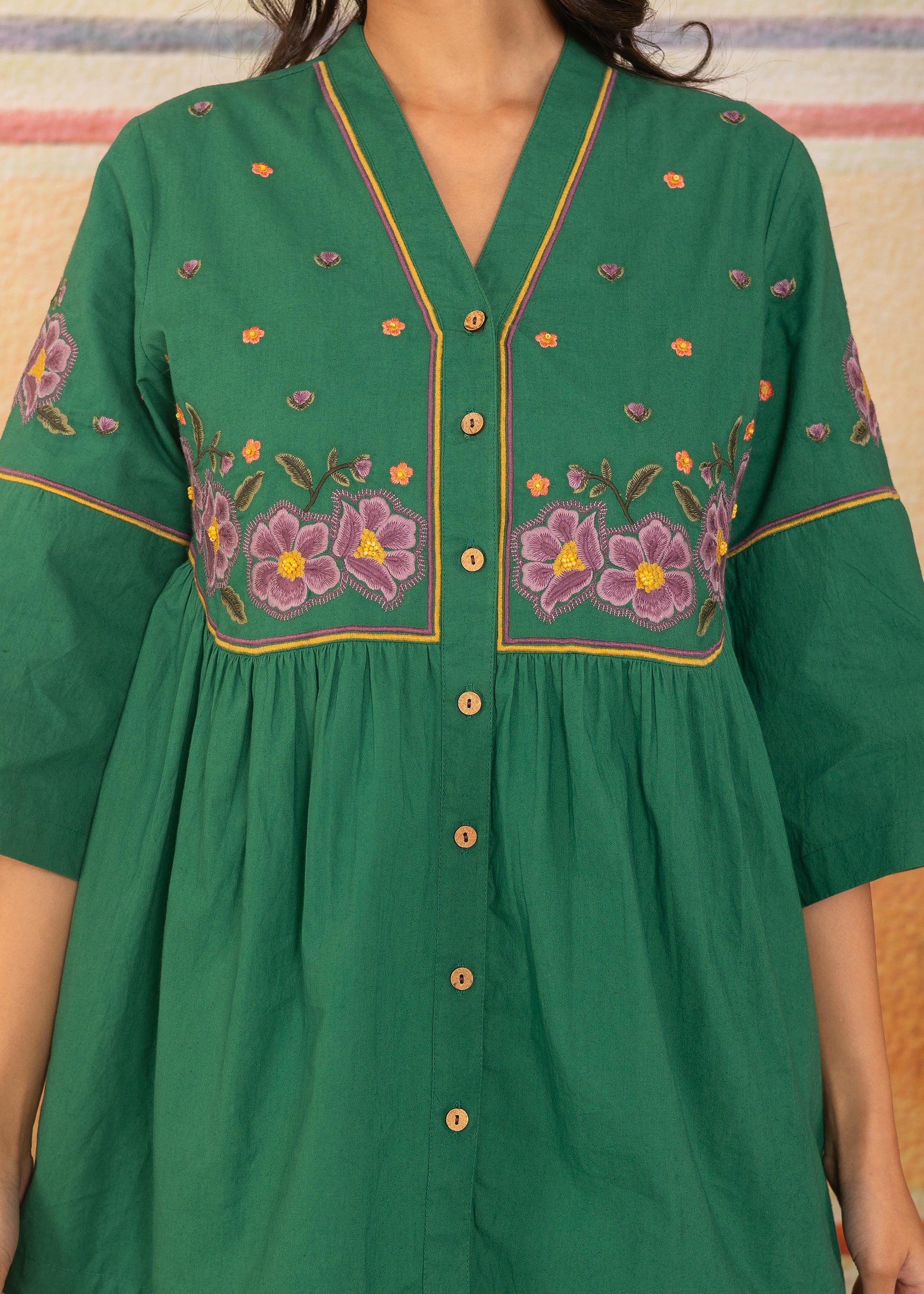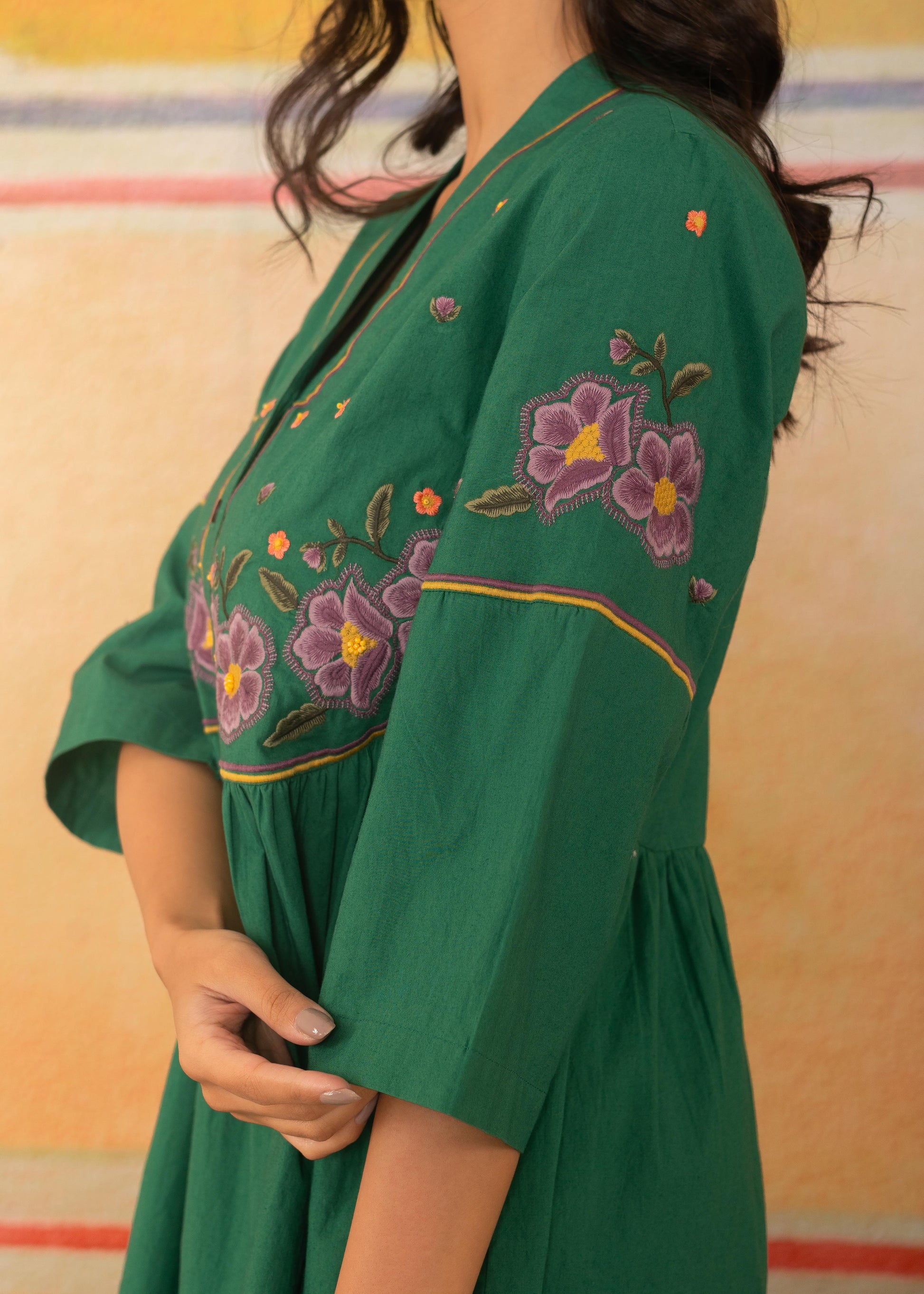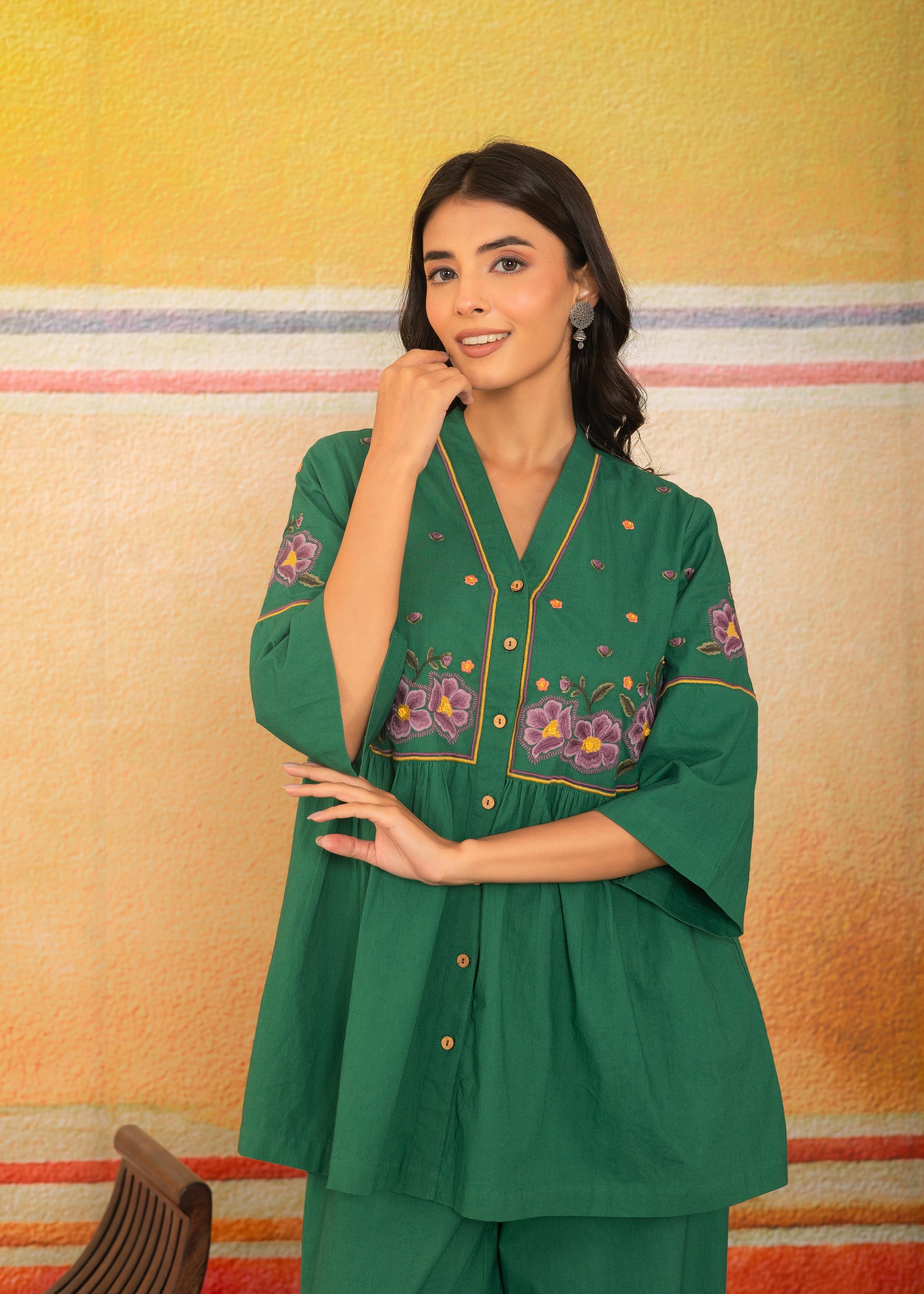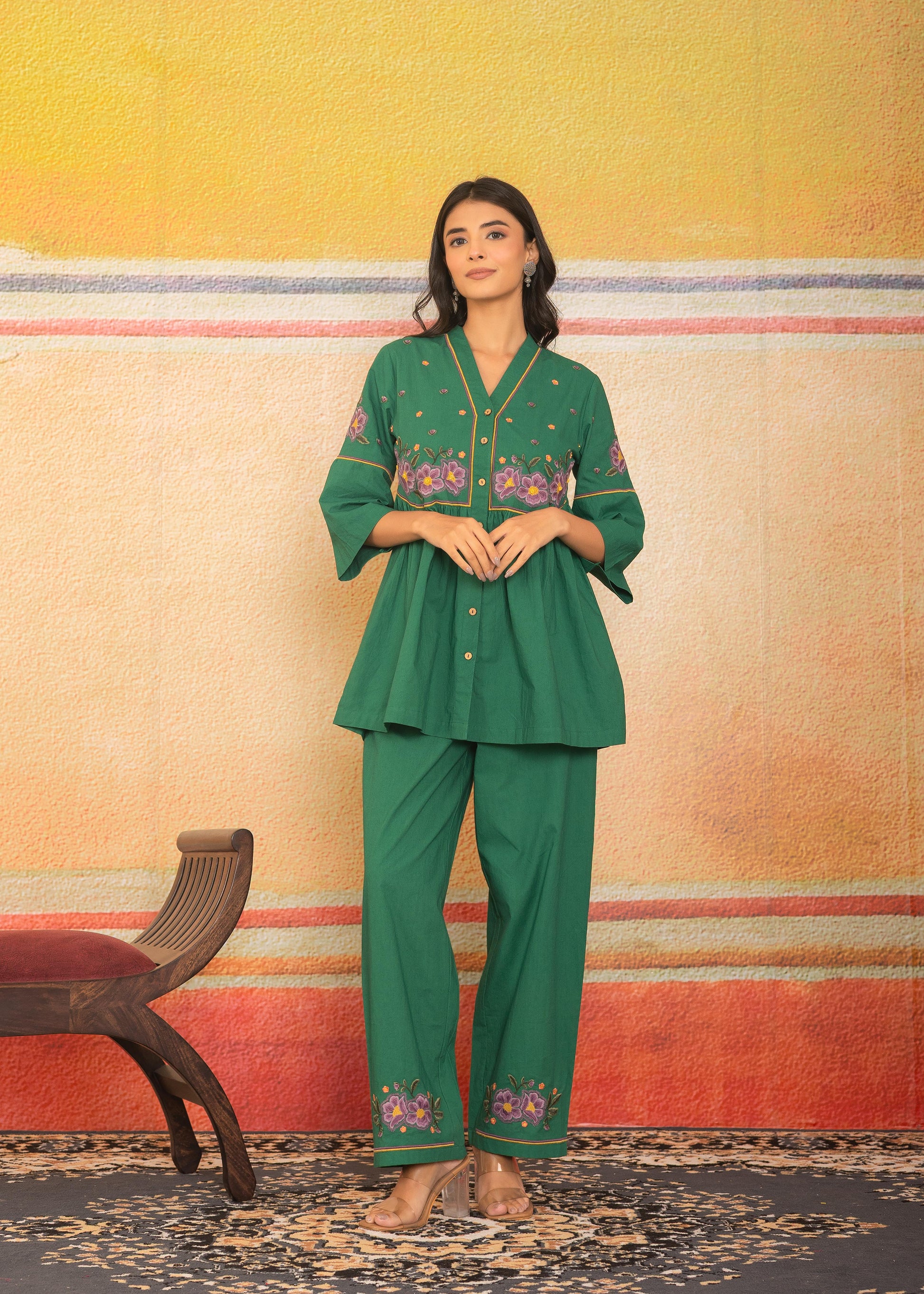A refreshing take on everyday elegance, the Azura Leaf Bloom Co-ord Set brings together vibrant green hues with intricate floral embroidery in shades of purple and gold. The flared top with soft pleats adds movement and ease, while the matching trousers feature delicate embroidered details at the hem for a coordinated finish. Crafted in breathable cotton, this set offers the perfect balance of comfort and sophistication — whether styled for a day out or an evening gathering.