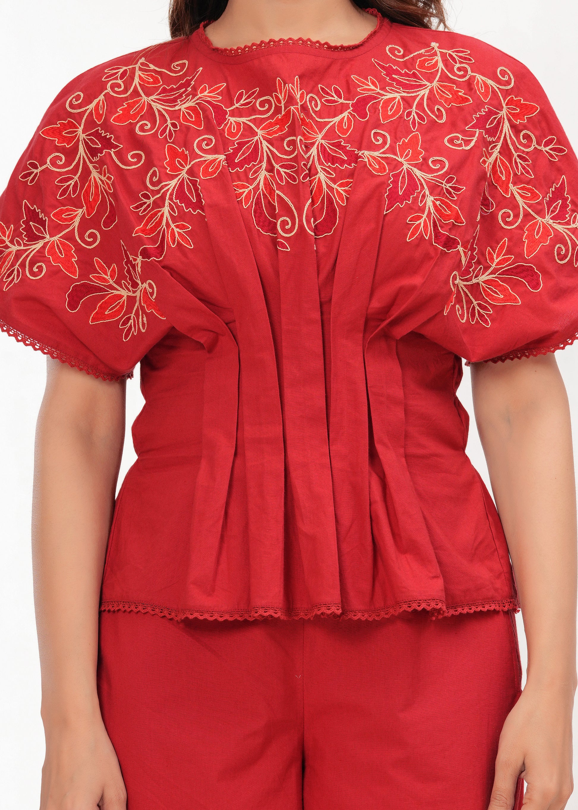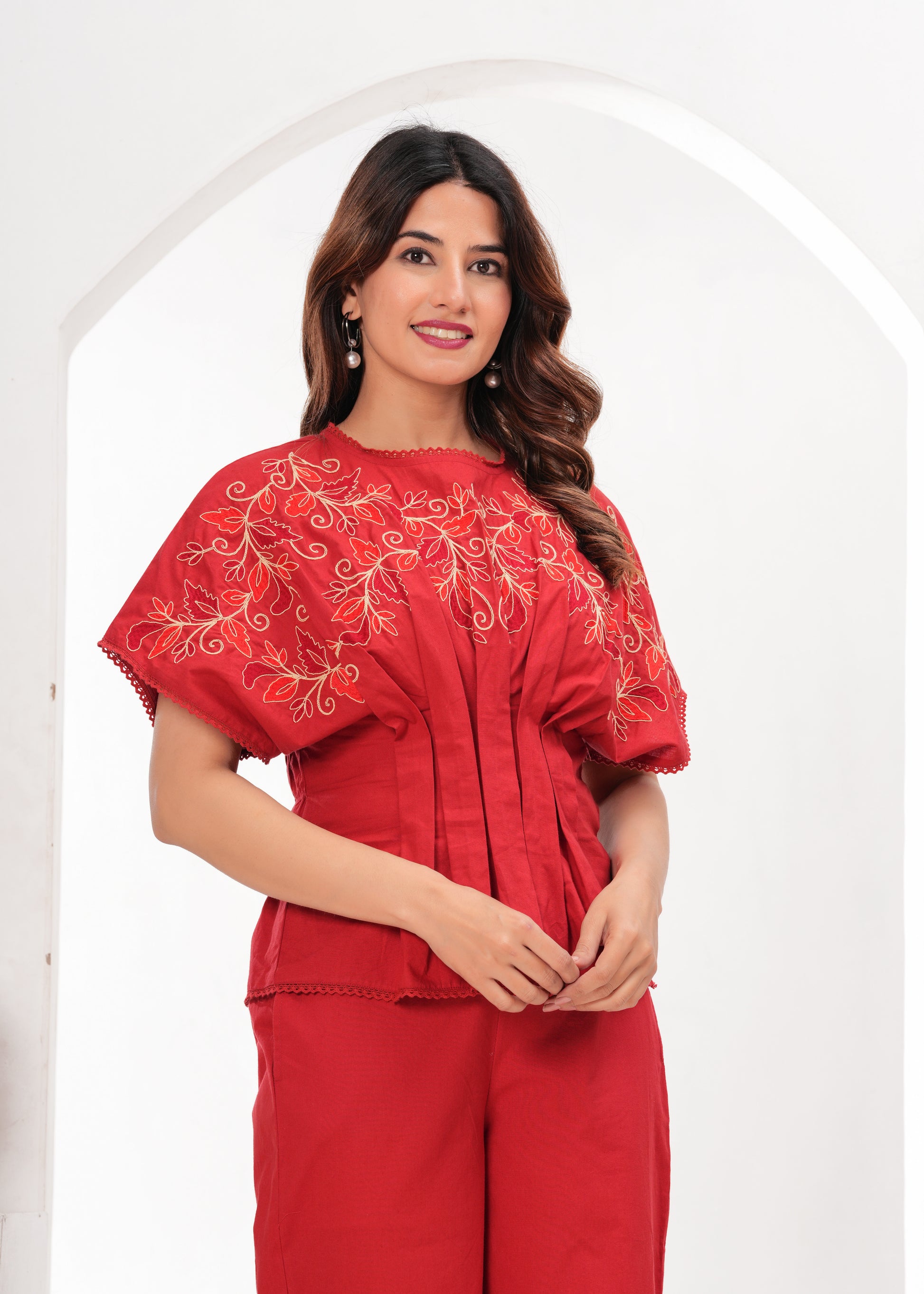 Bold yet graceful — the Carmine Bloom Co-ord Set blends structured pleats with delicate embroidery across soft cotton. Its sculpted sleeves and vibrant hue bring effortless sophistication to everyday dressing.