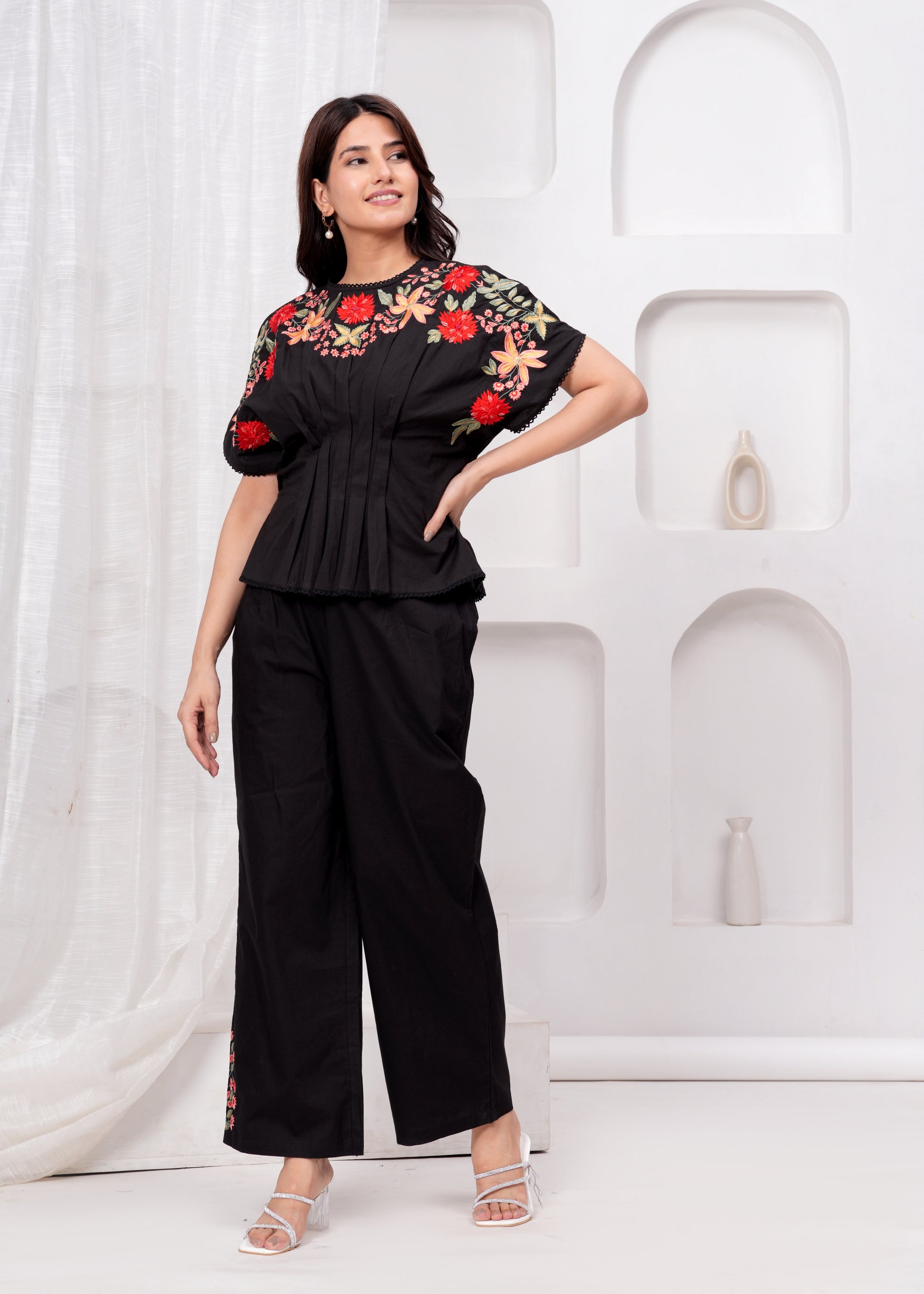 Soft cotton meets delicate embroidery in this co-ord set. The top features vibrant floral stitching across shoulders and sleeves, while gentle pleats lend structure without stiffness. The trousers follow with a relaxed fit and subtle embroidery at the hem. Scalloped edges bring a refined finish.