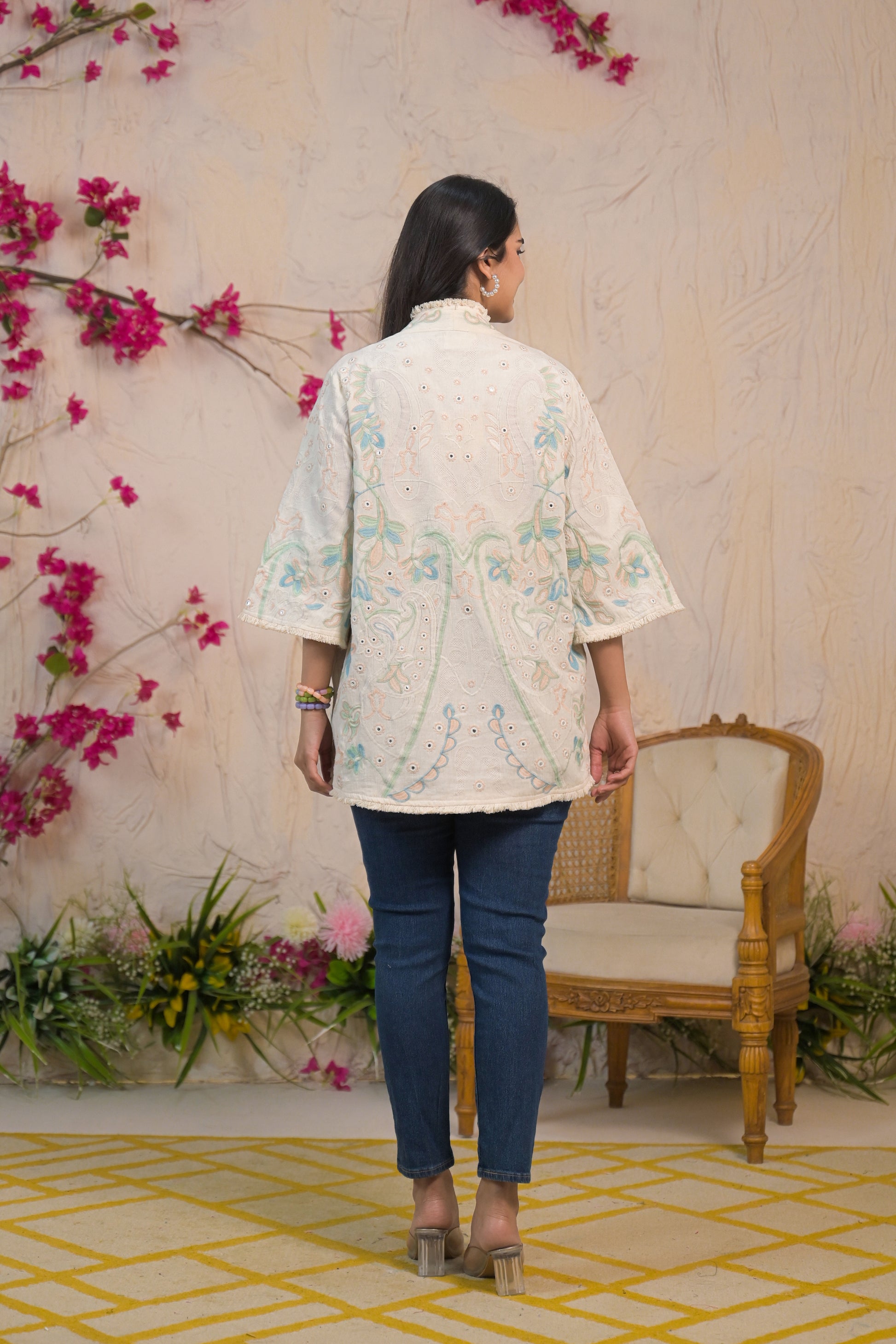Soft tones and gentle embroidery come together in a silhouette that feels effortlessly free. The Cloud Garden Jacket layers natural texture with quiet detail — light, versatile, and made for days that drift between ease and elegance.