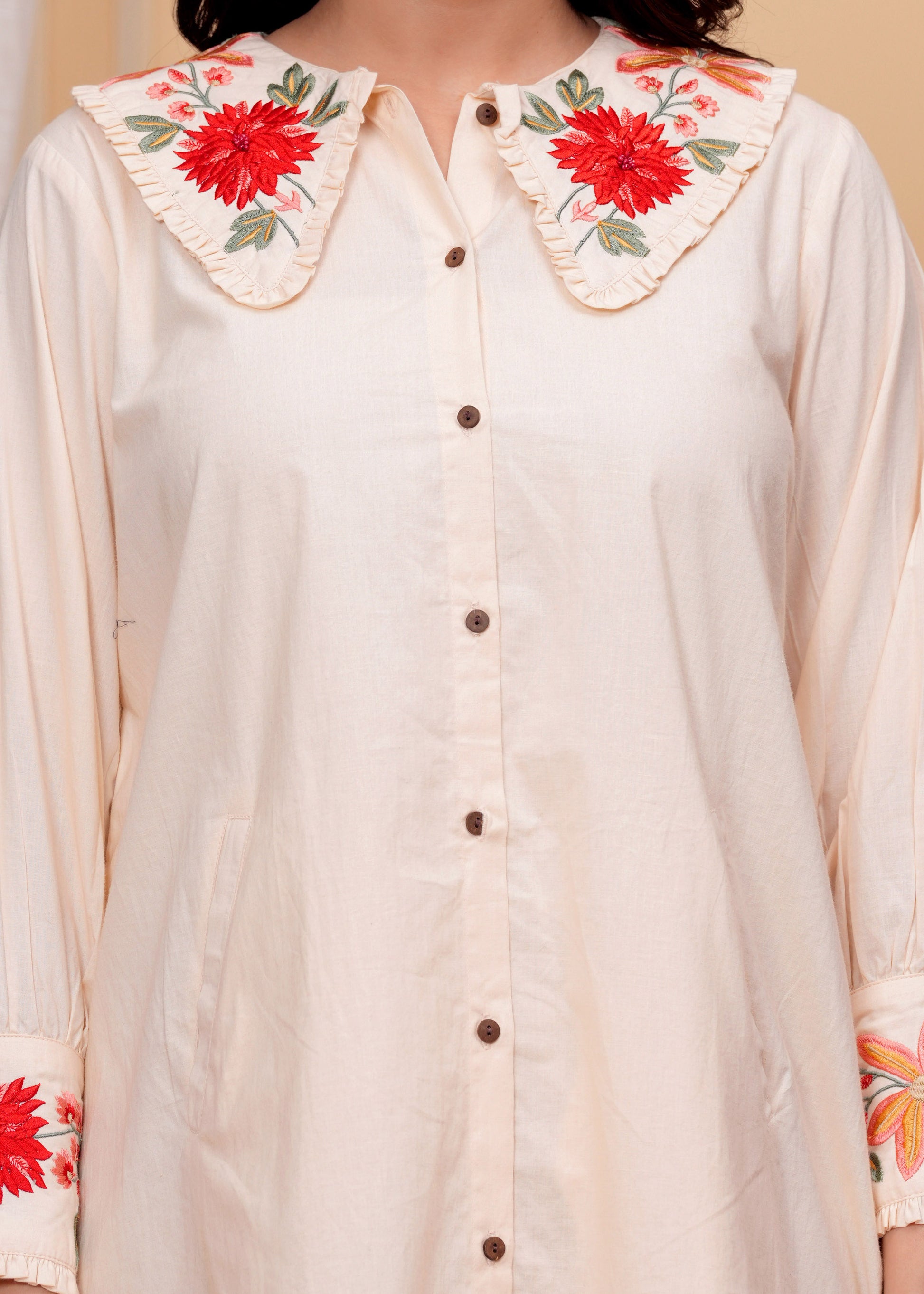 A softened silhouette with thoughtful detail — this shirt dress features scalloped hemlines and a standout embroidered collar with floral accents. The sleeves echo the embroidery, while side pockets add functional ease.