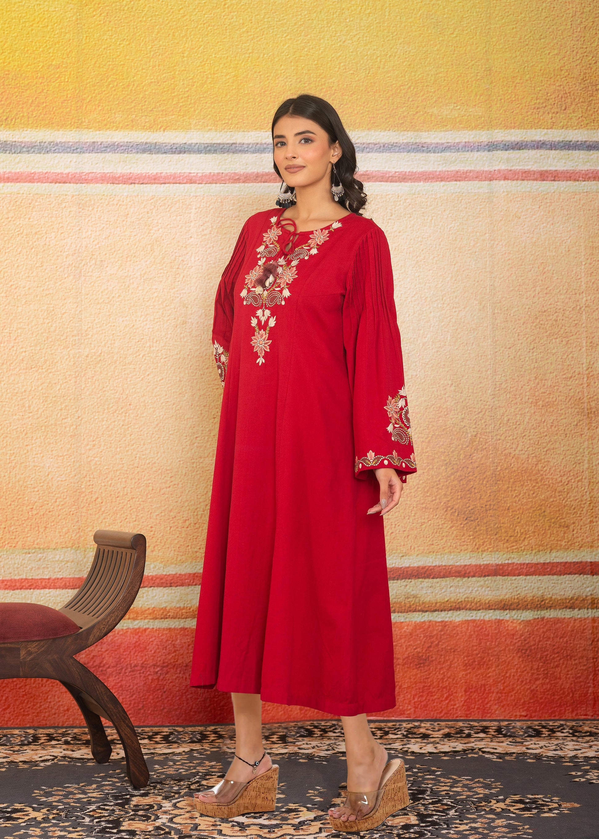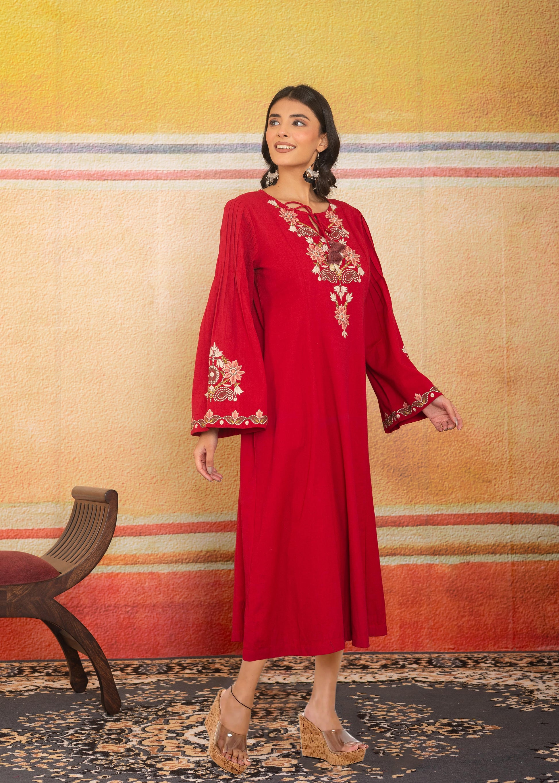Dramatic sleeves and fine gold embroidery — this dress blends effortless movement with artisan detail. The flowing silhouette carries elegance, while the deep red hue invites subtle presence.