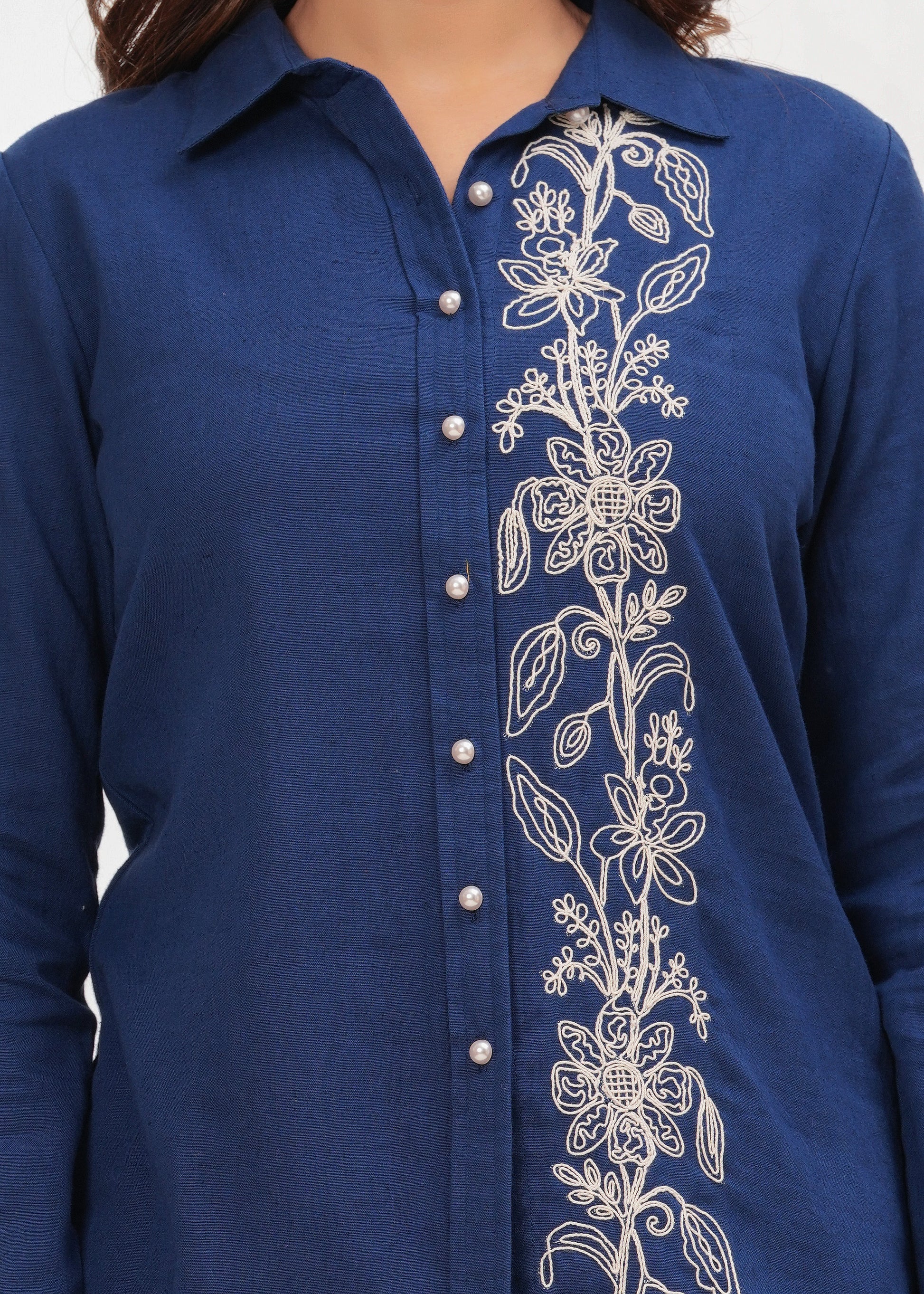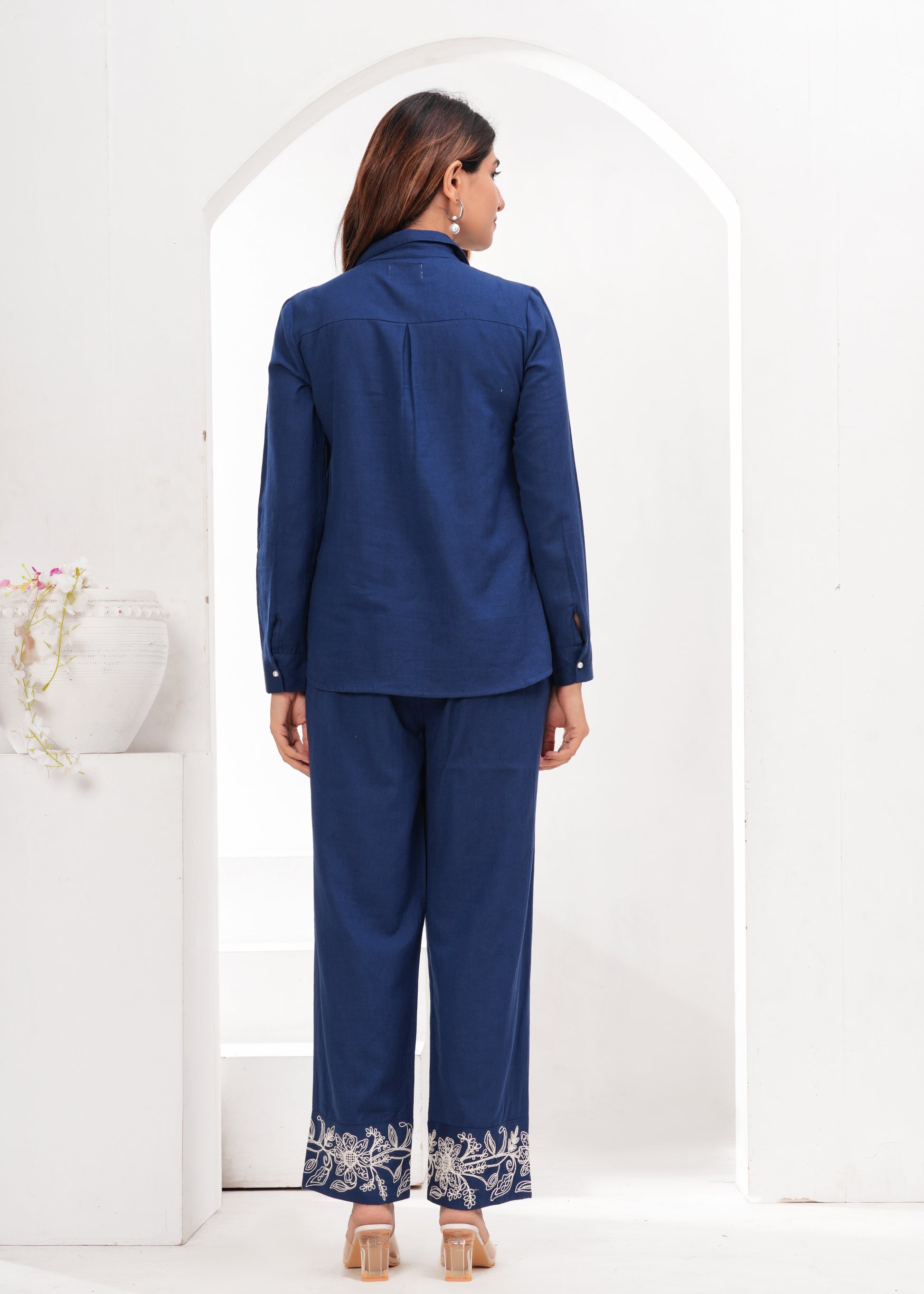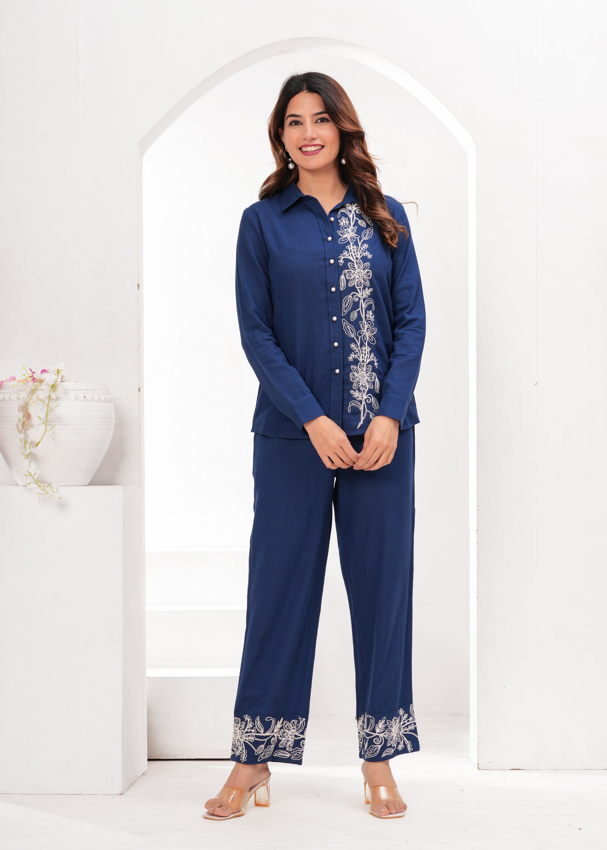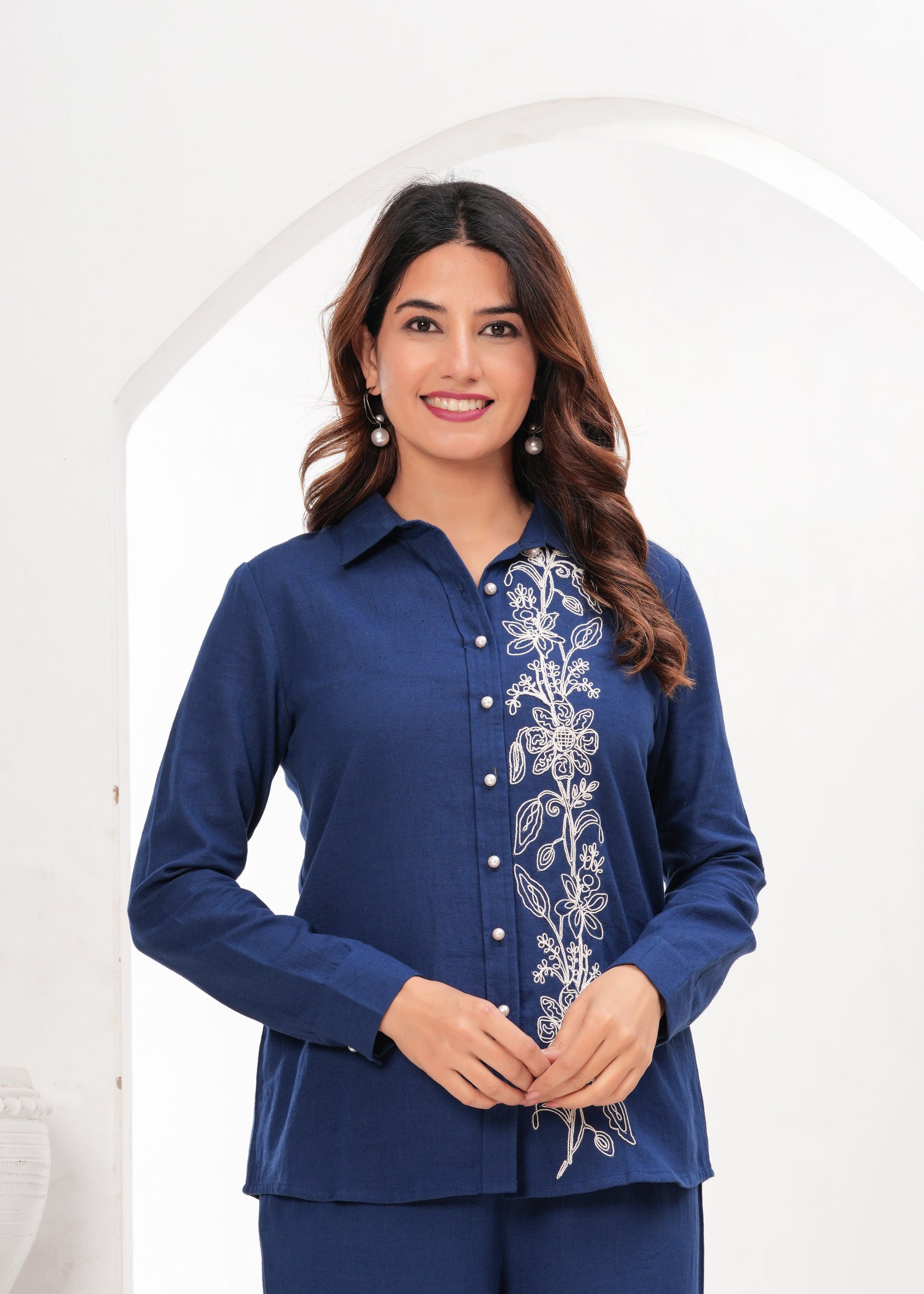 Classic navy meets delicate bloom — this co-ord set features white floral embroidery along the button-down collared top, with echoing detail at the pant hems. The structured top and wide-leg pants move in harmony, balancing ease with intention.