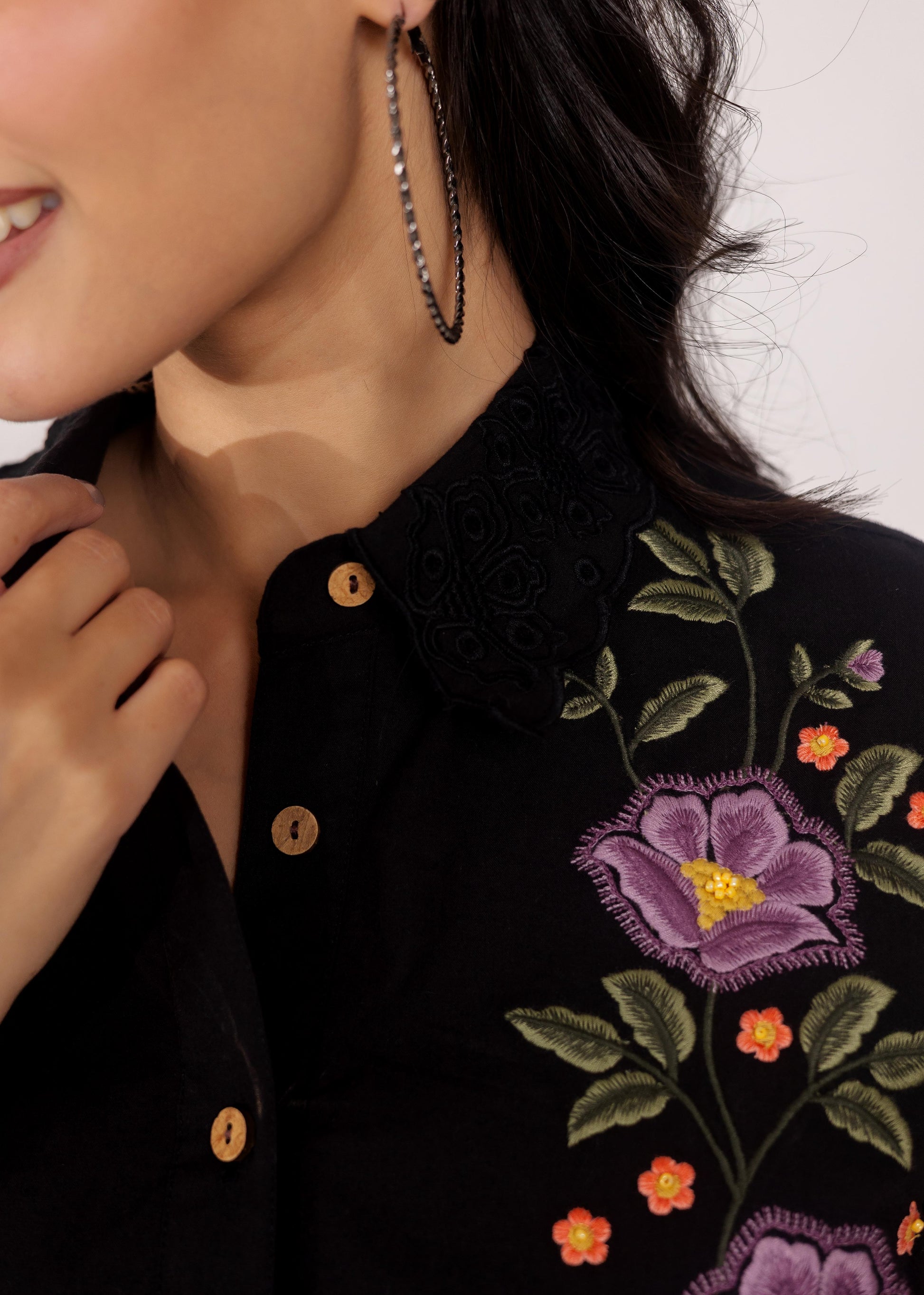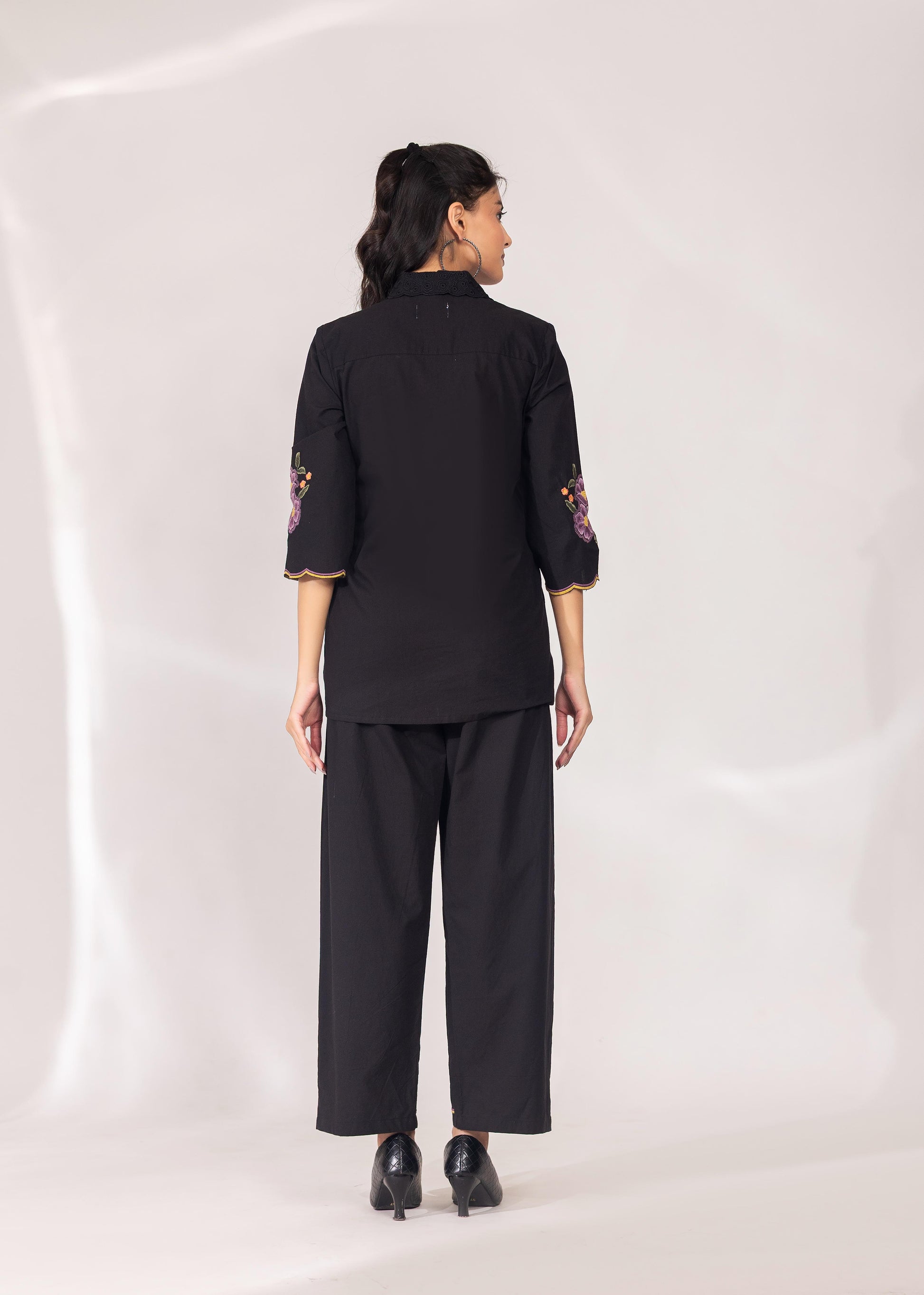 A black canvas, softly embroidered — this co-ord set pairs deep tonal ground with floral accents in purple and green. The silhouette balances structuring and ease, giving a poised look without pressure.