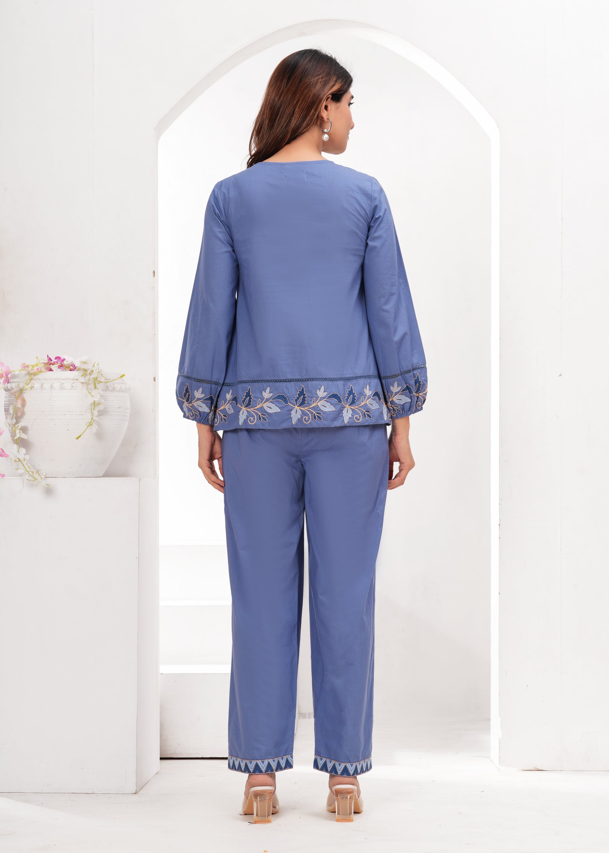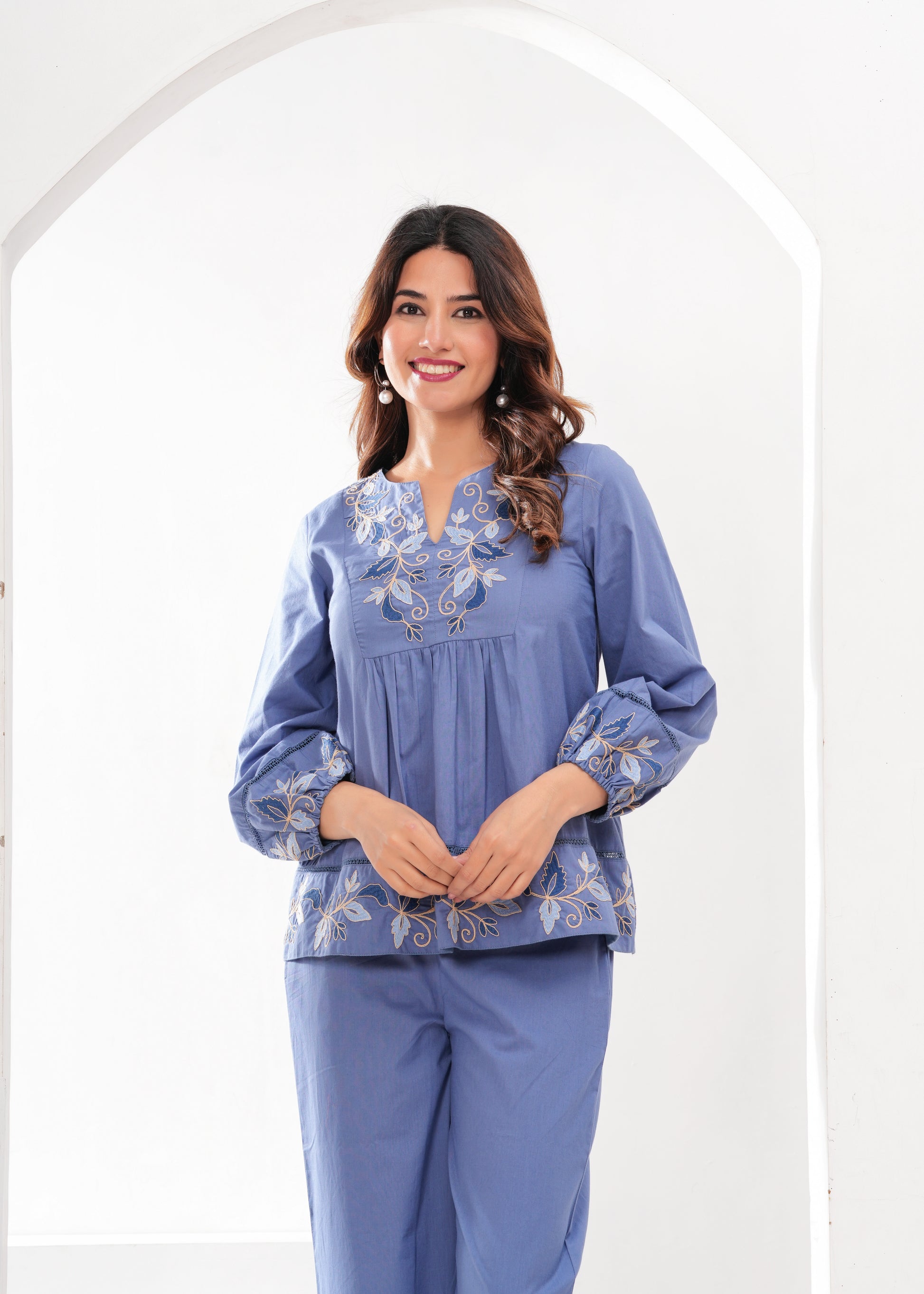 A calm blue canvas with subtle detail. This co-ord set features light embroidery across the top and trousers, echoing the same motif at cuffs. The cut blends structure with ease — relaxed without losing shape.