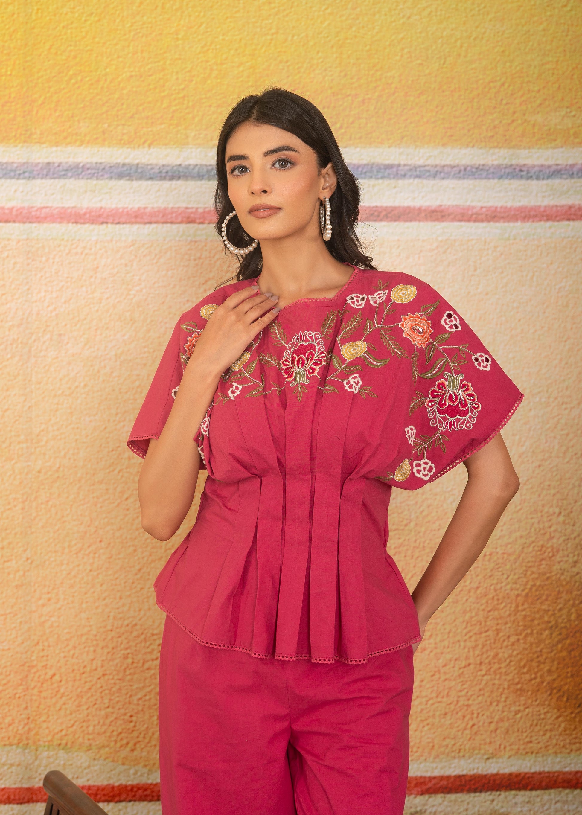 A pleated top meets floral embroidery — this co-ord set marries structure with softness. The yoke and sleeves carry delicate blooms; the trousers move with ease.