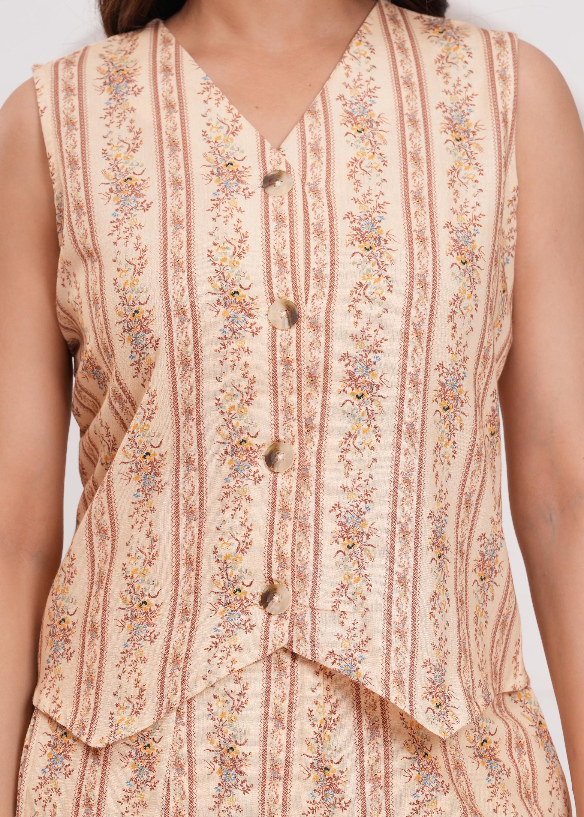 A striped canvas with soft detail — this co-ord set features vertical beige and yellow lines, accented by subtle florals along the stripe paths. The sleeveless button-down top has a structured V-neck and pointed hem; the wide-leg trousers mirror the relaxed elegance.
