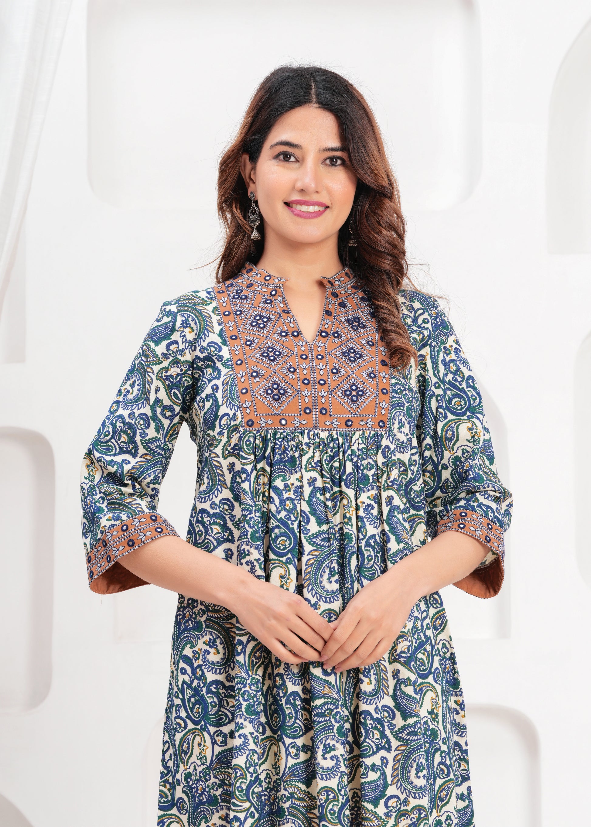 A flowing silhouette meets paisley print. This dress features a rich blue and ivory motif, grounded by intricate yoke and sleeve border details in warm, earth-toned contrast.