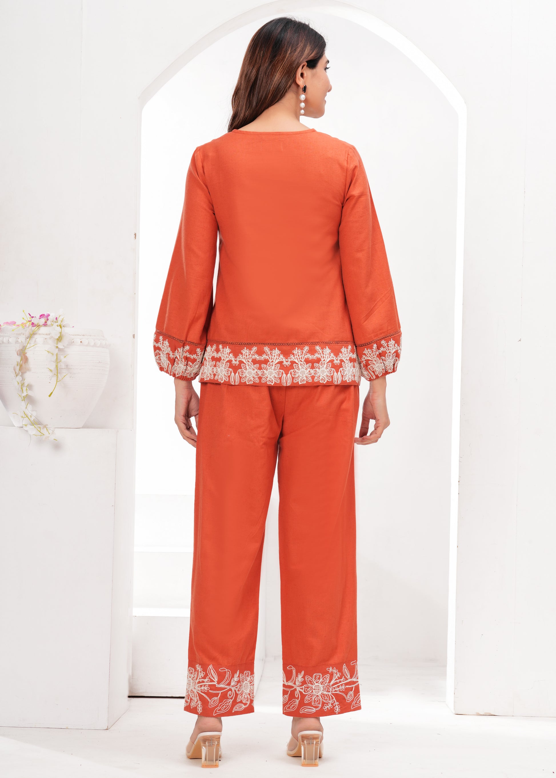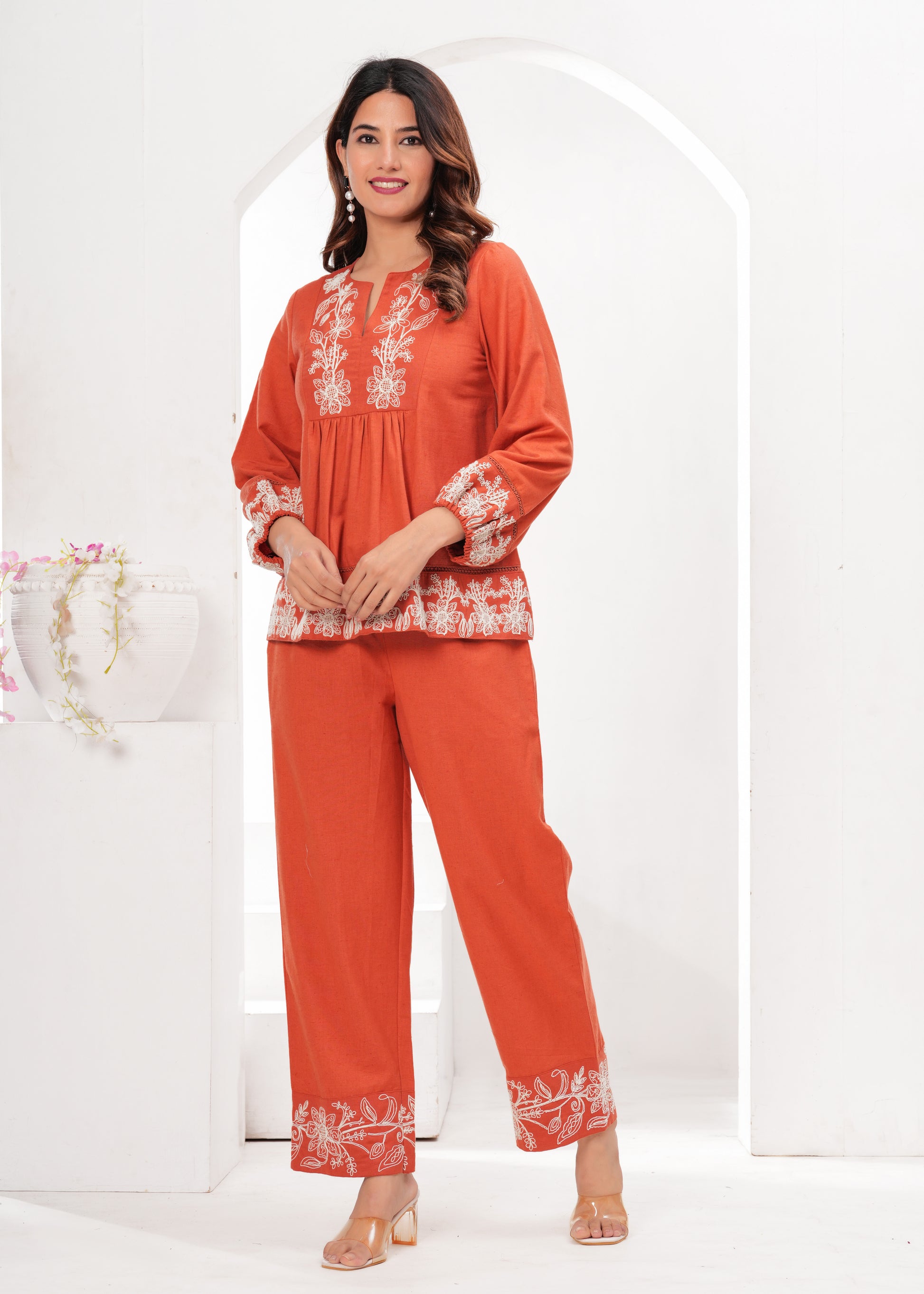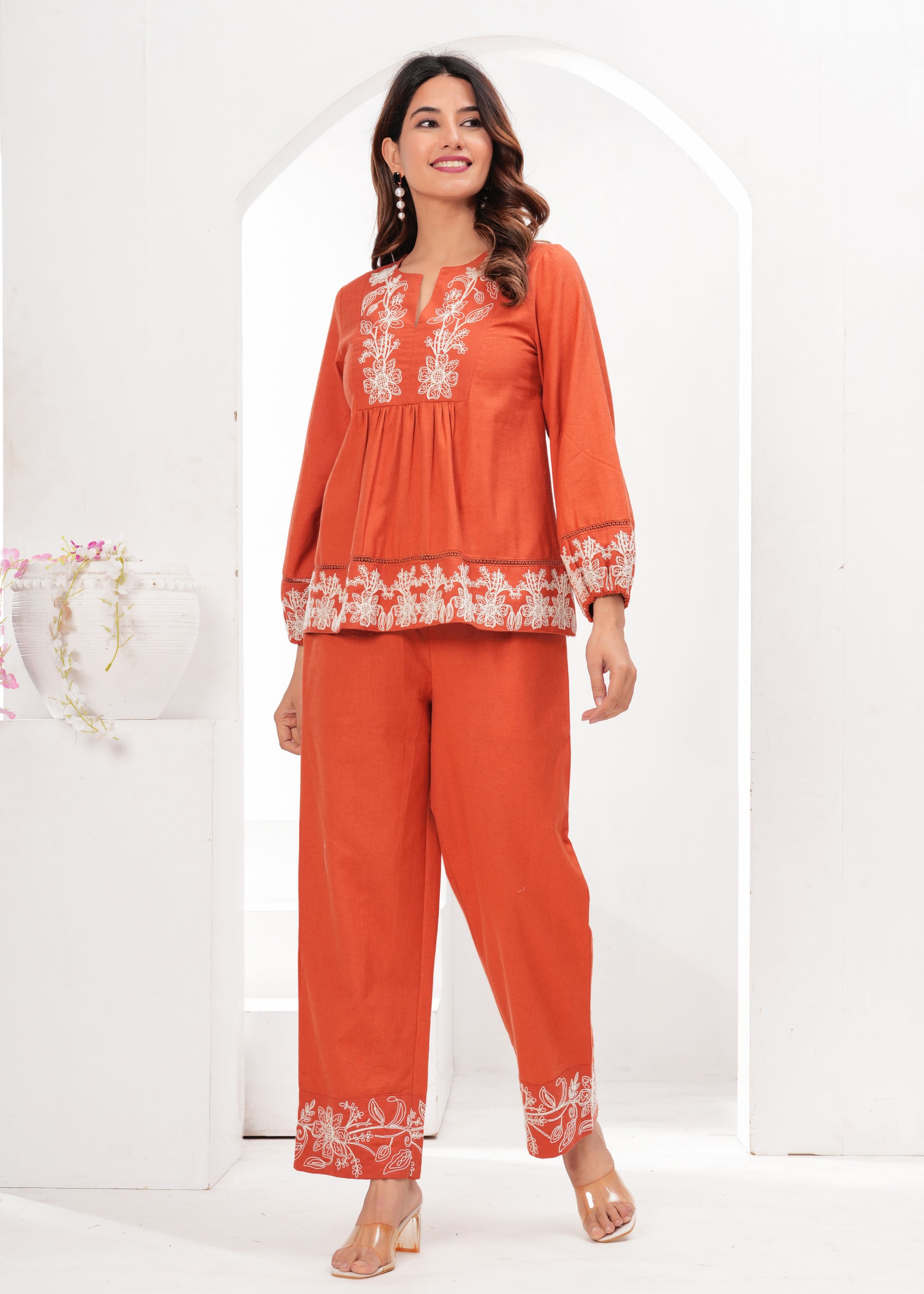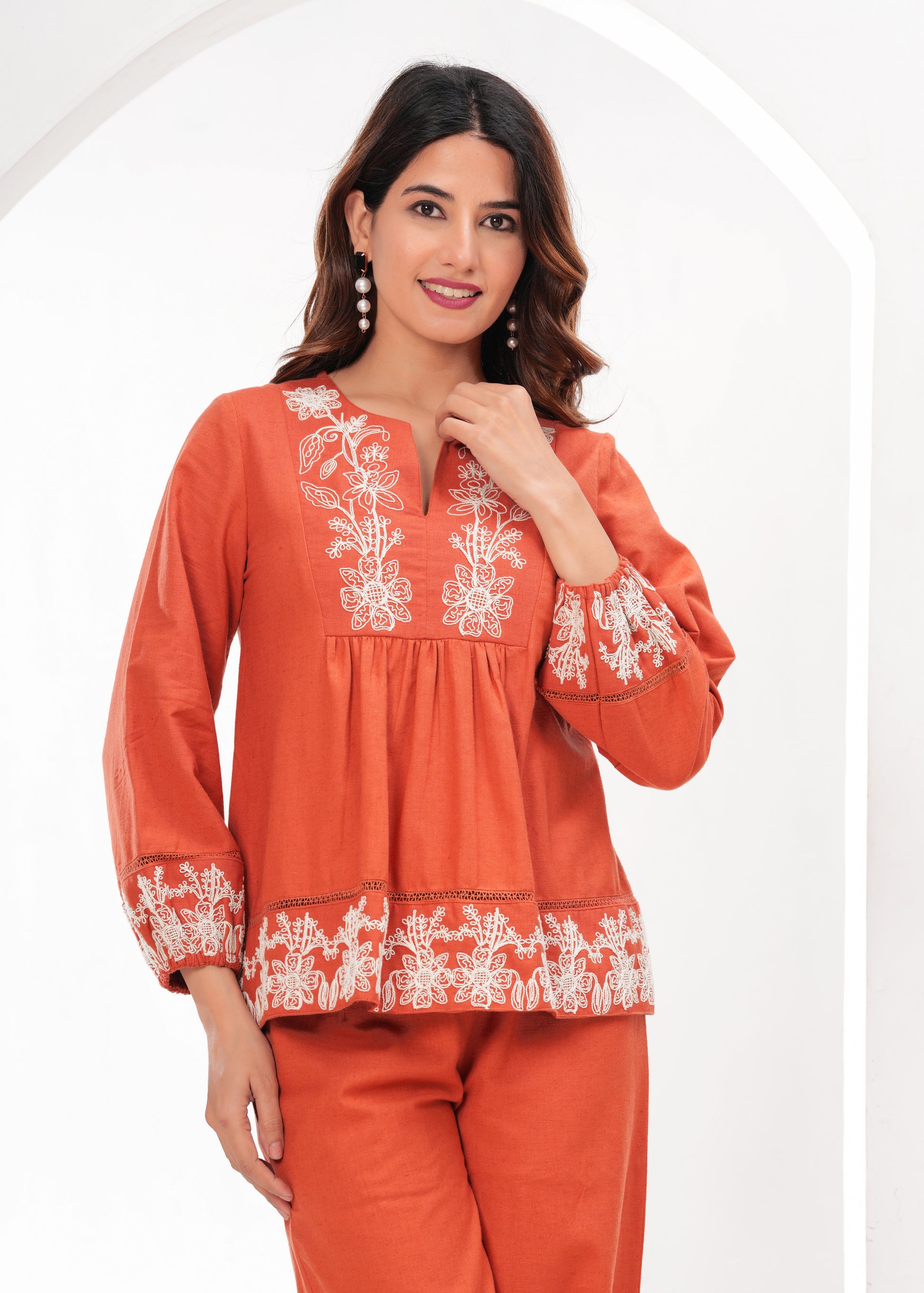 Warm orange tones with white floral embroidery — neckline, sleeves, hem