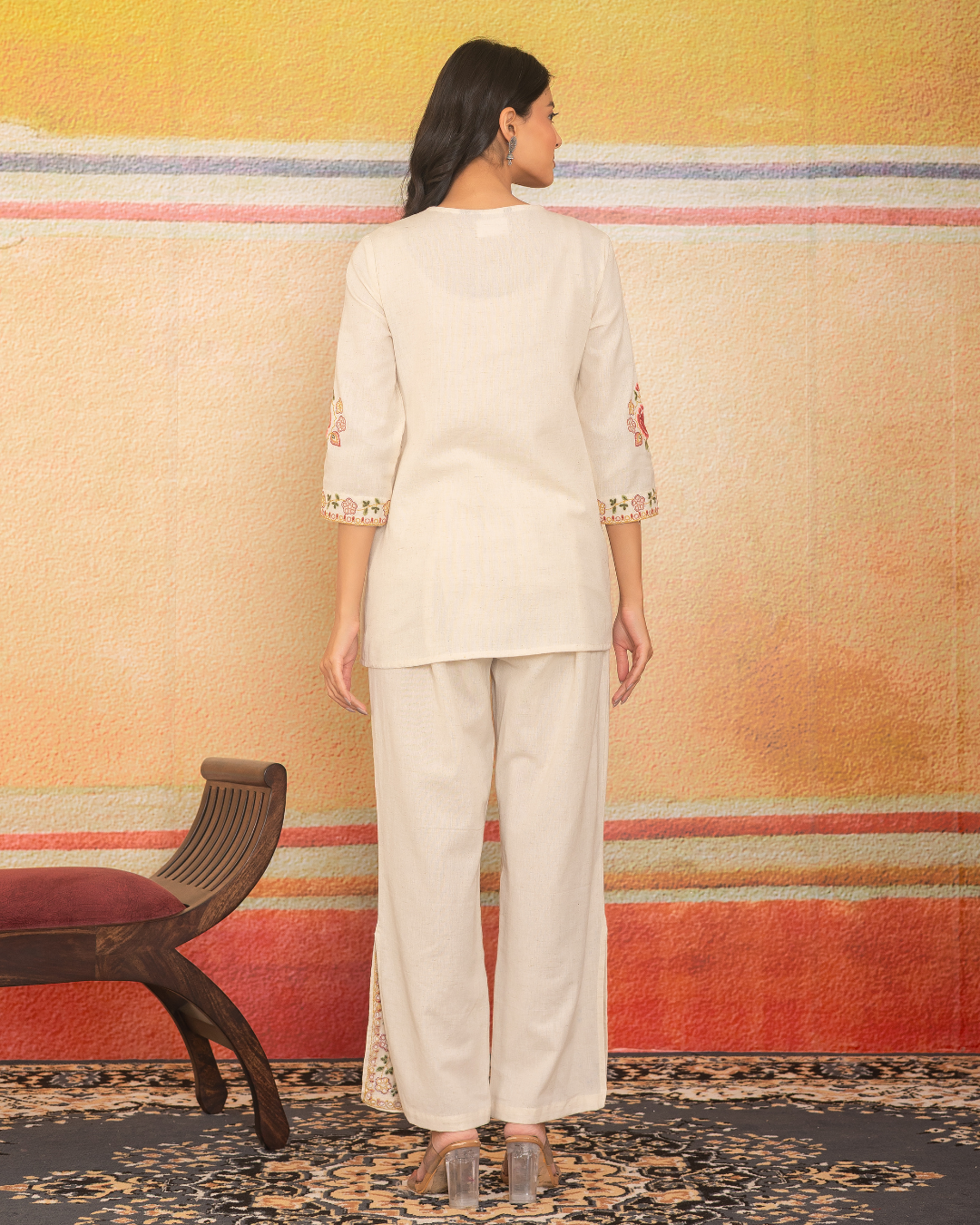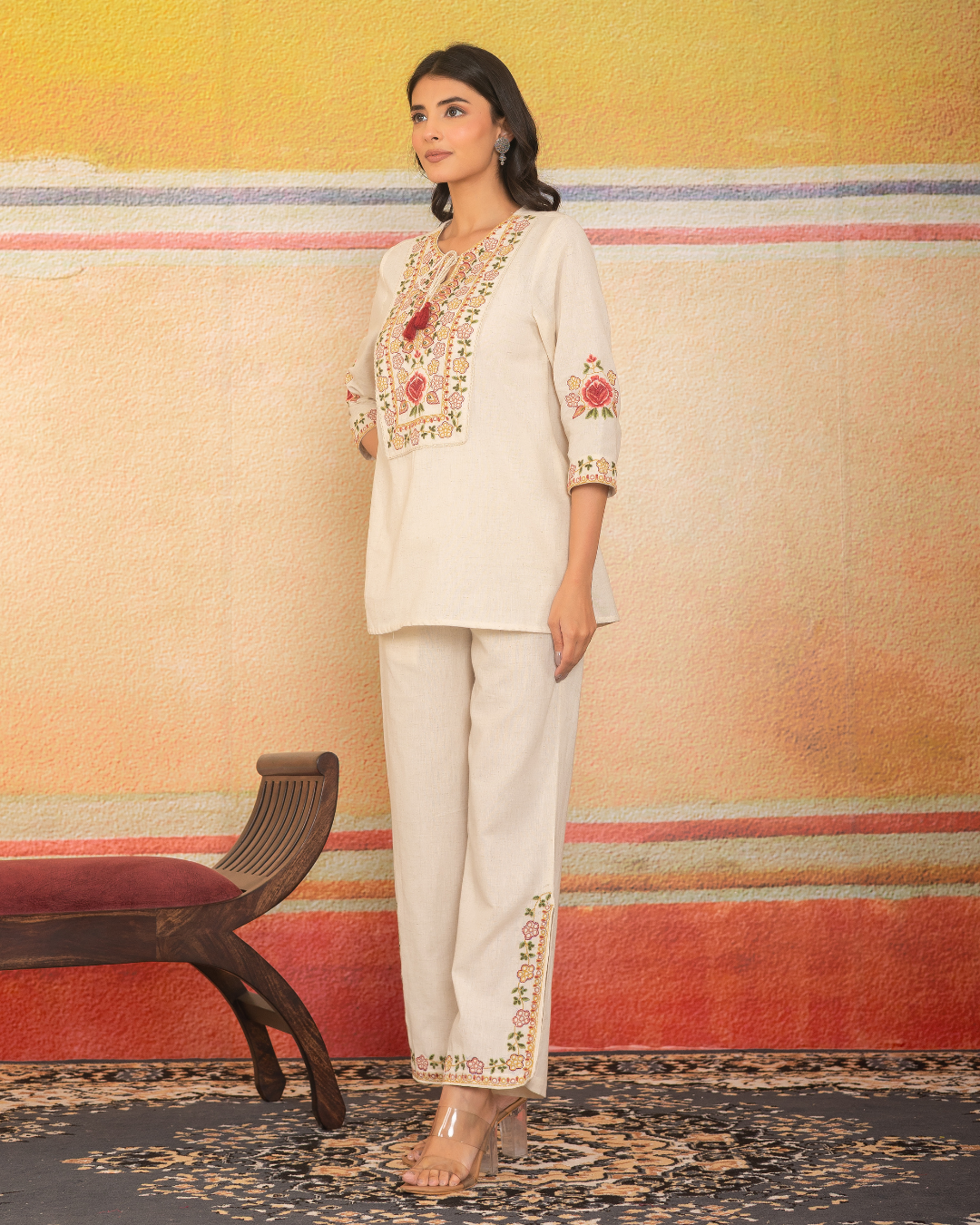 The Sunkissed Meadow Set captures effortless elegance with its soft khadi base and intricate floral embroidery in hues of red, gold, and green. The handcrafted tassel tie-up neckline and detailed sleeve accents add a touch of rustic charm, while the embroidered pant hems complete the look with finesse. Breezy yet refined, this set is perfect for sunny brunches, festive mornings, or serene getaways.
