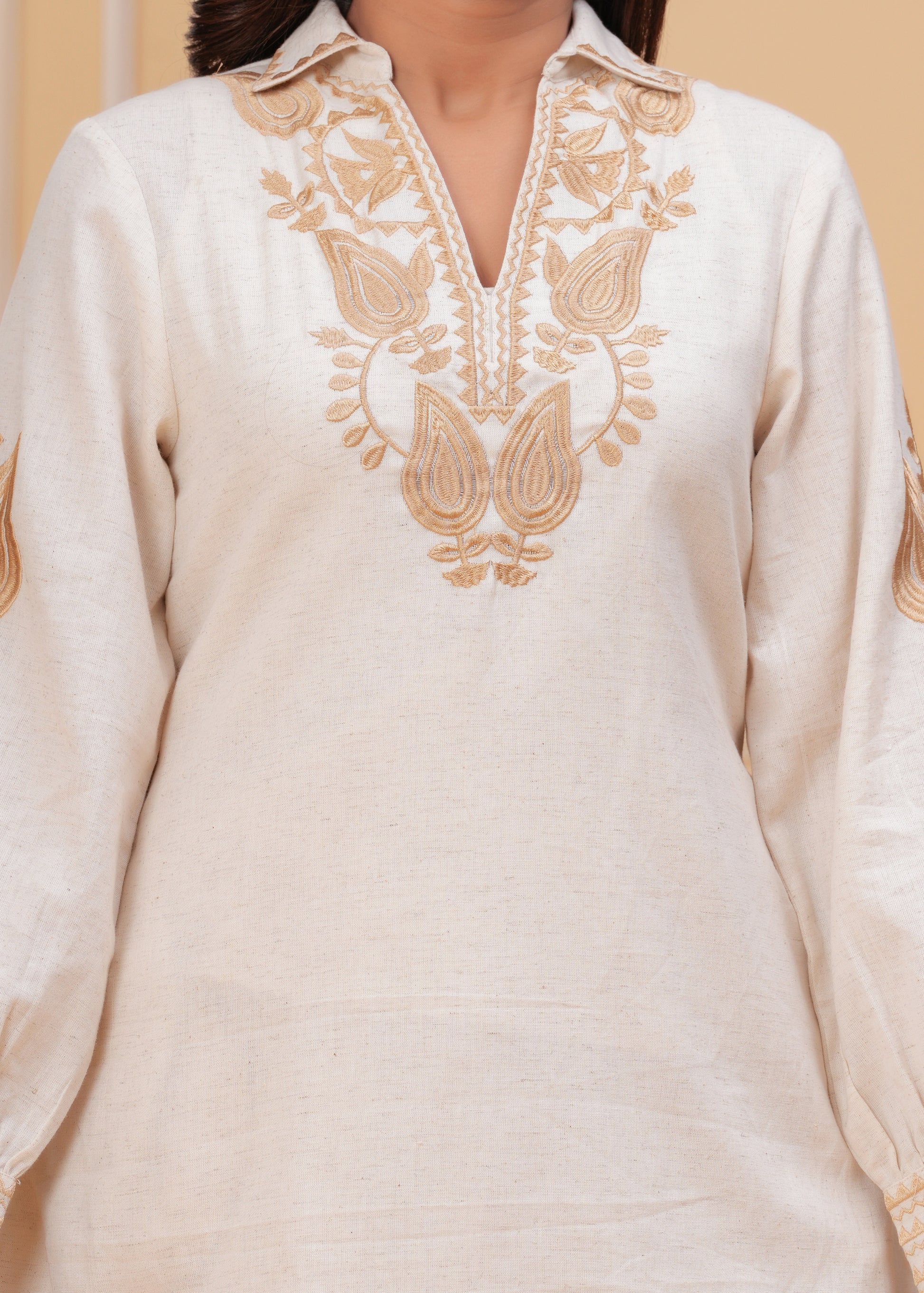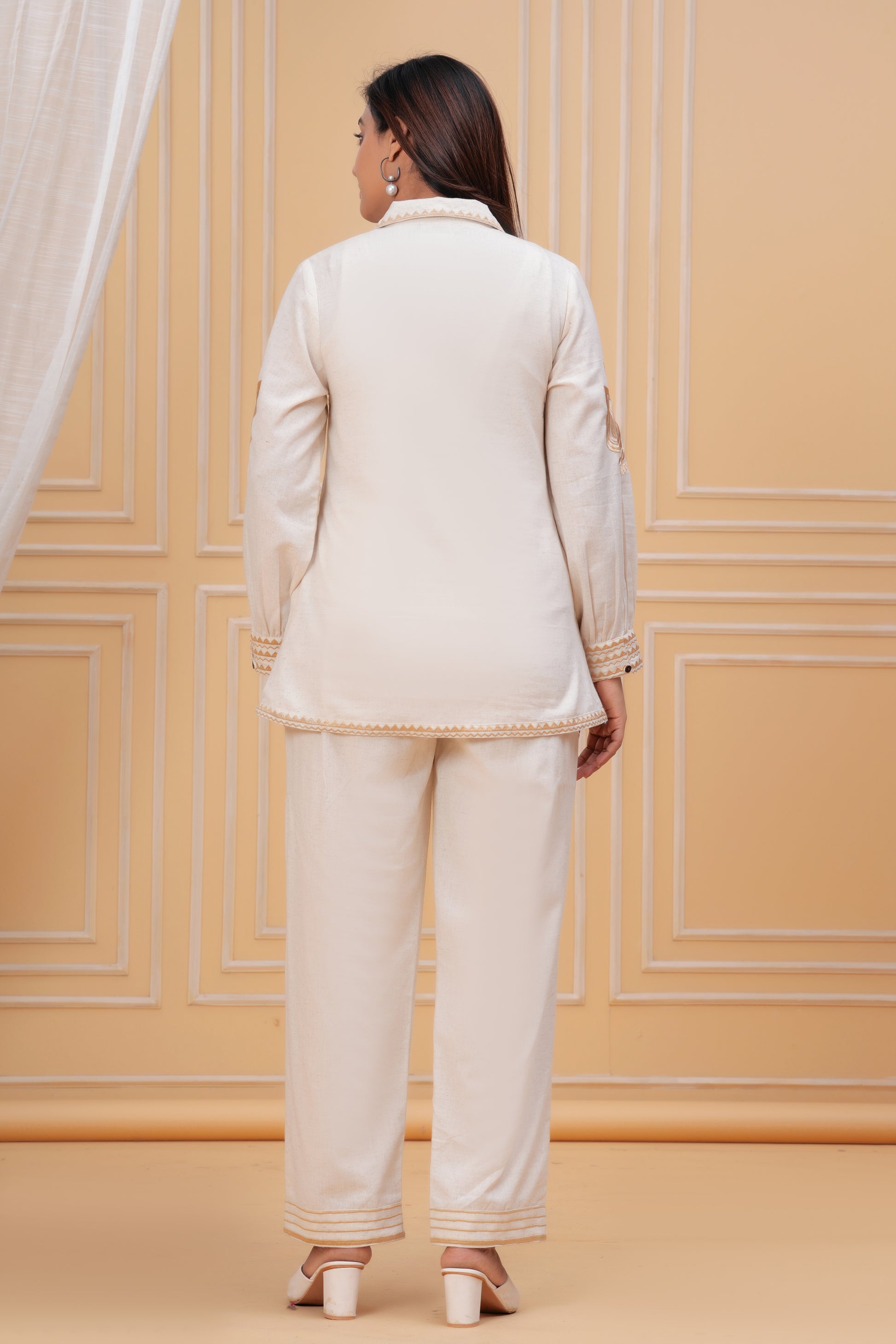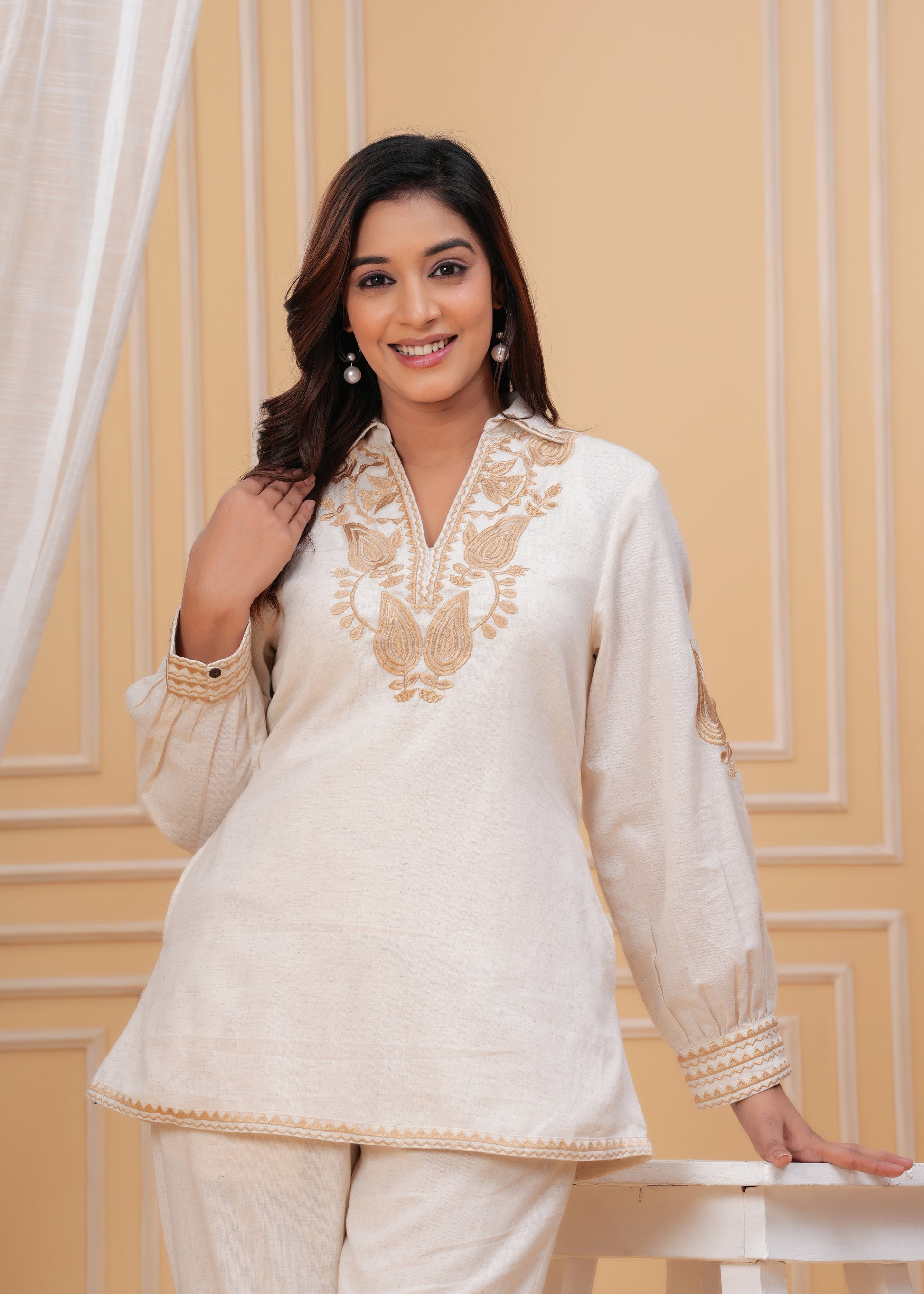 A soft ivory hue framed by gold embroidery — the V-neck top features fine motifs along neckline, sleeves, and hem, paired with straight trousers accented at the cuffs.