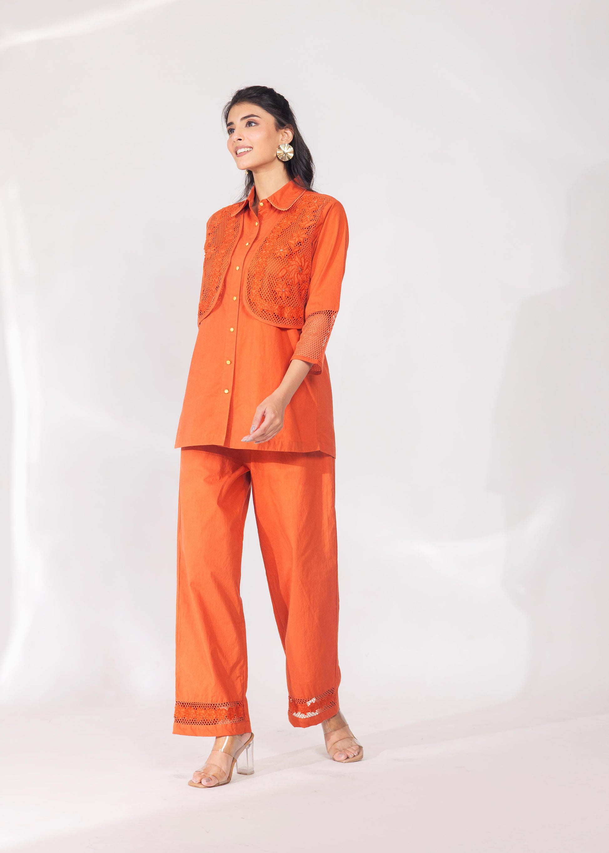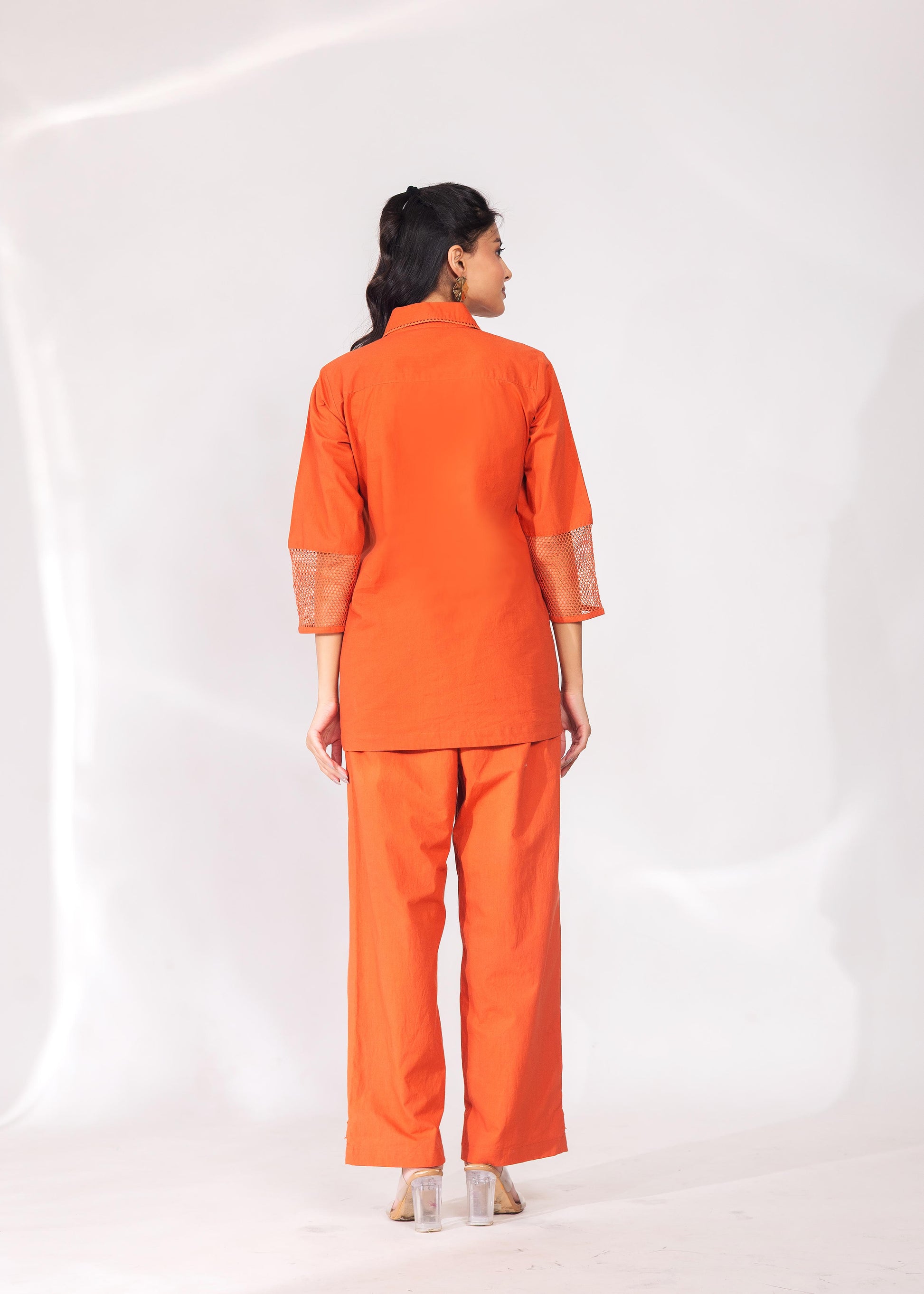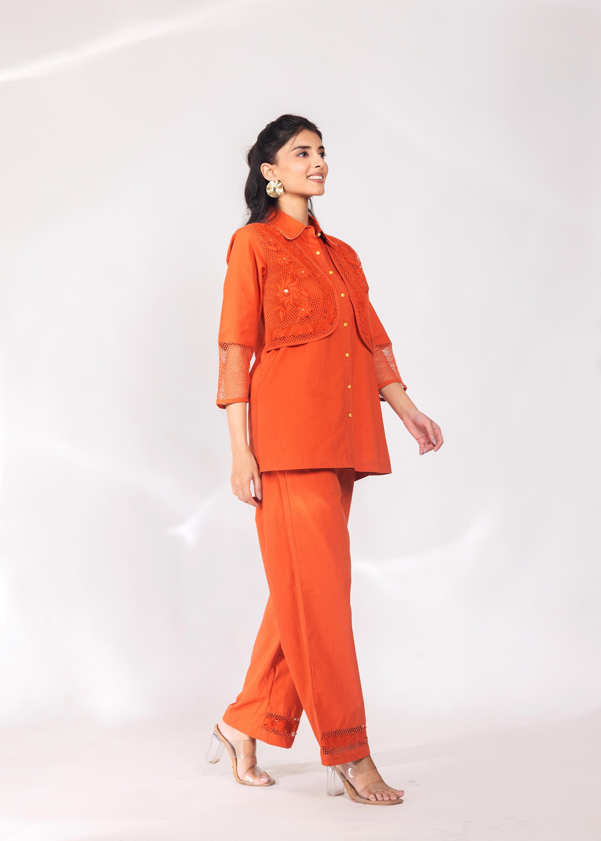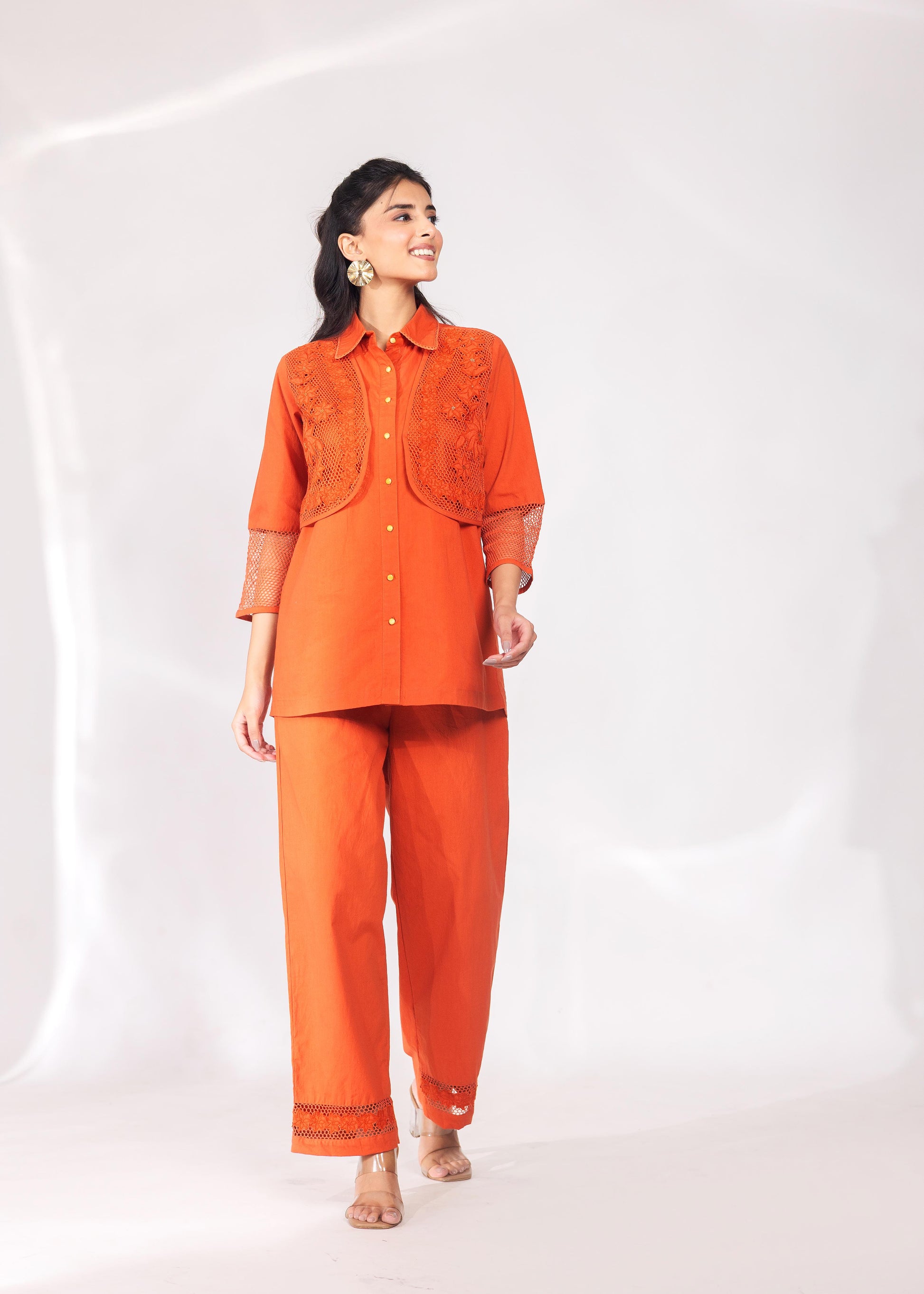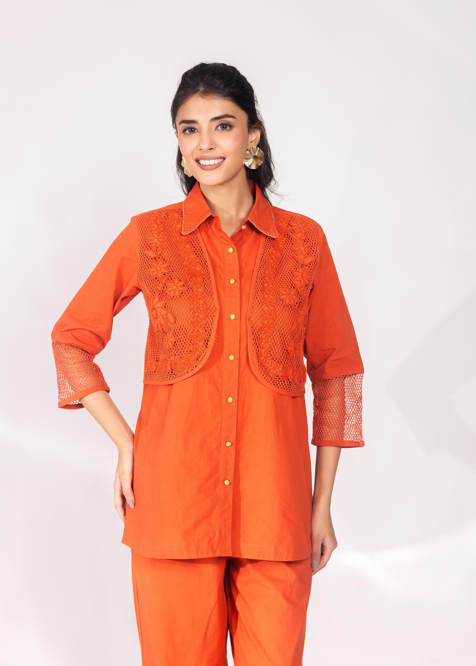 A warm rust tone meets delicate lacework in this co-ord set. The collared shirt carries lace detailing at the yoke and sleeves; the trousers mirror the motif at the hem.
