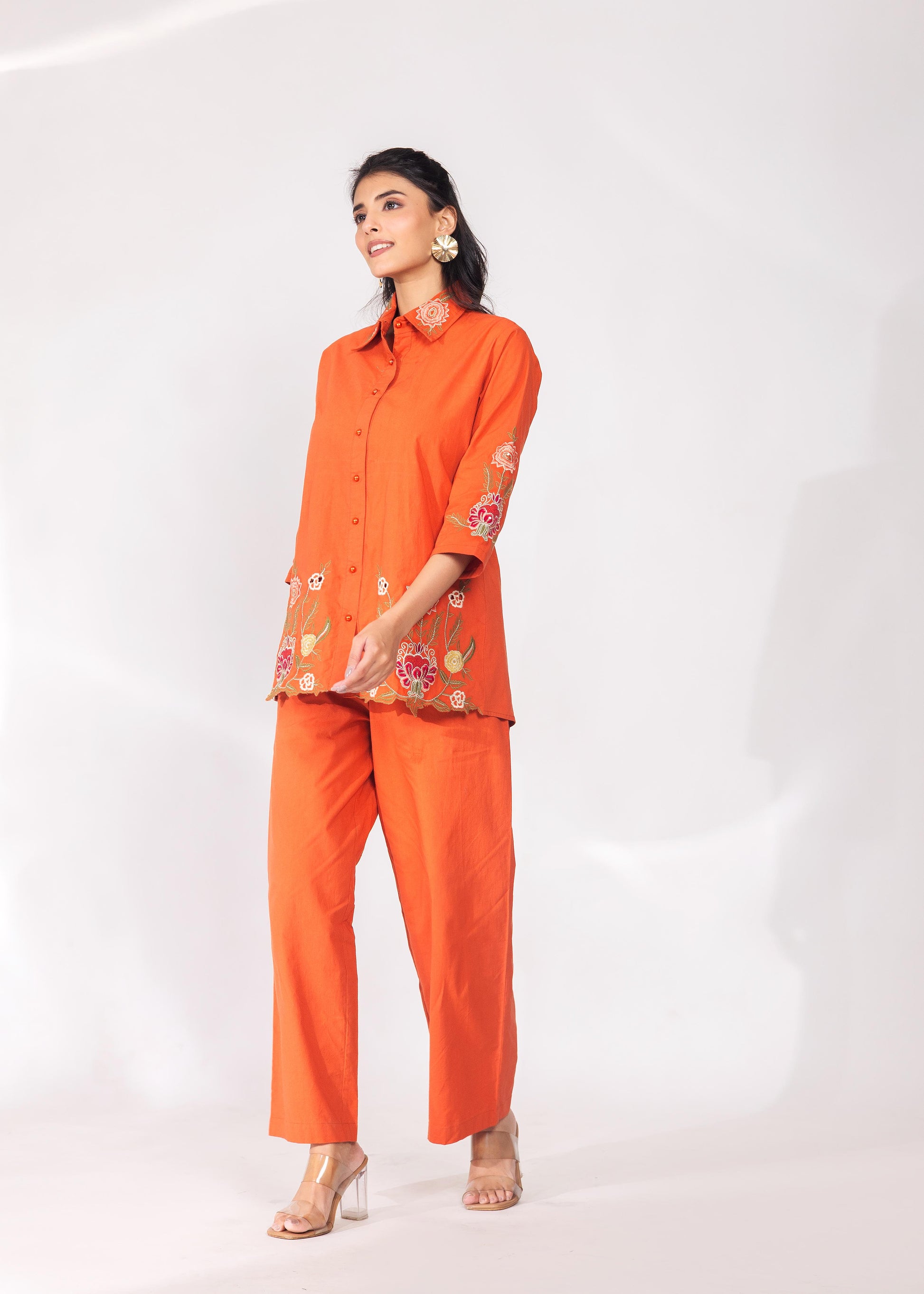 Bright orange with thoughtful, floral embroidery in red, white, green