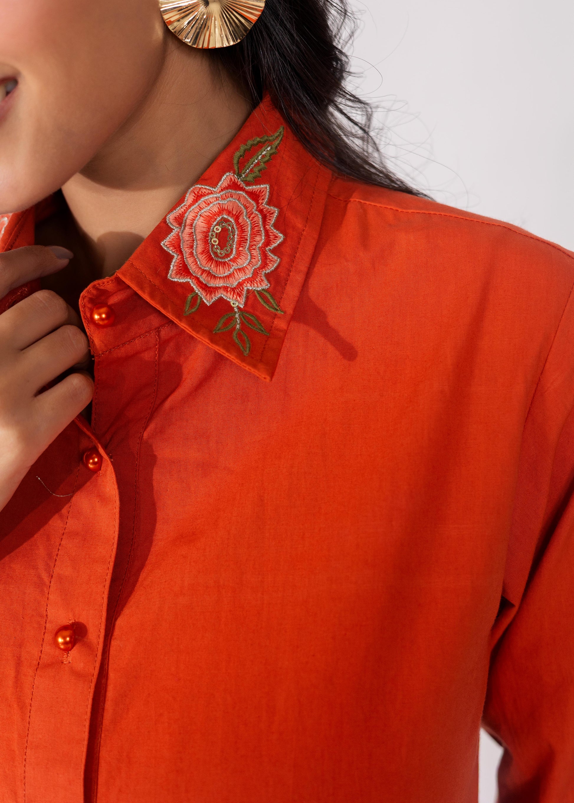 A warm orange base meets delicate floral embroidery in red, white, and green. The collar, sleeves, and hem bear subtle detail; the silhouette is breezy and easy.